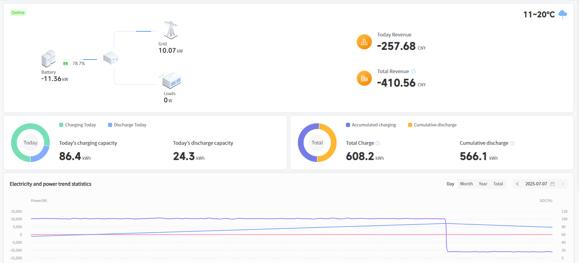 [Day]Display your selected plant today's battery charging power, battery discharge power, photovoltaic power and electricity power, support screening query history records.
