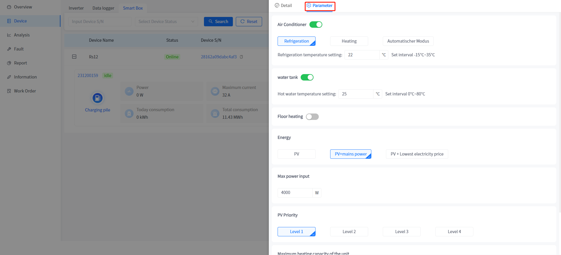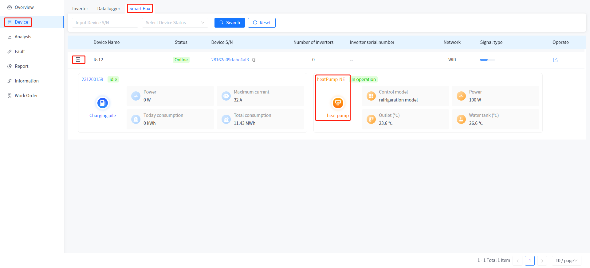 This system supports the addition and association of plants to Smart Box devices, as well as data viewing and parameter configuration of associated heat pump and charging station devices under Smart Box.