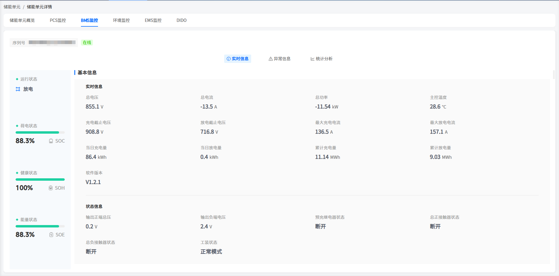 BMS实时信息页面中展示了该机柜中电池的详细运行数据,如:运行基本信息,运行状态、单体电芯运行信息、单体电芯详细运行数据等。