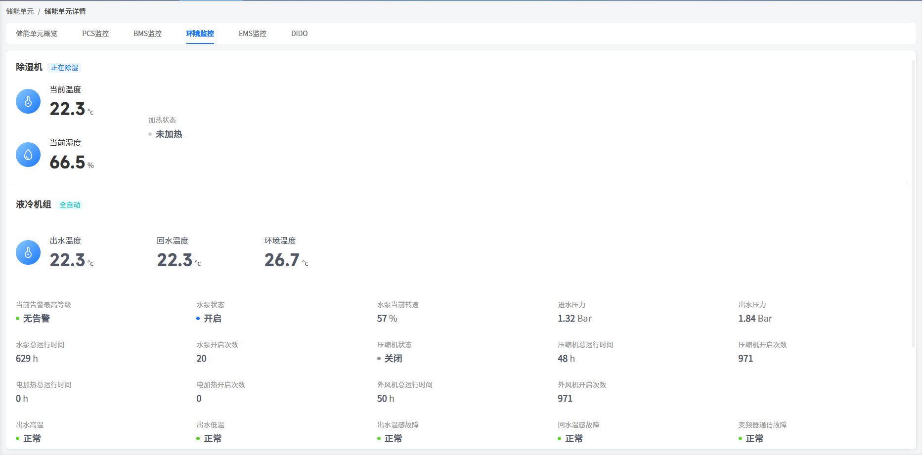 系统在环境监控页面中展示了除湿机工作的基本运行信息,您可以在该页面中进行查看。
