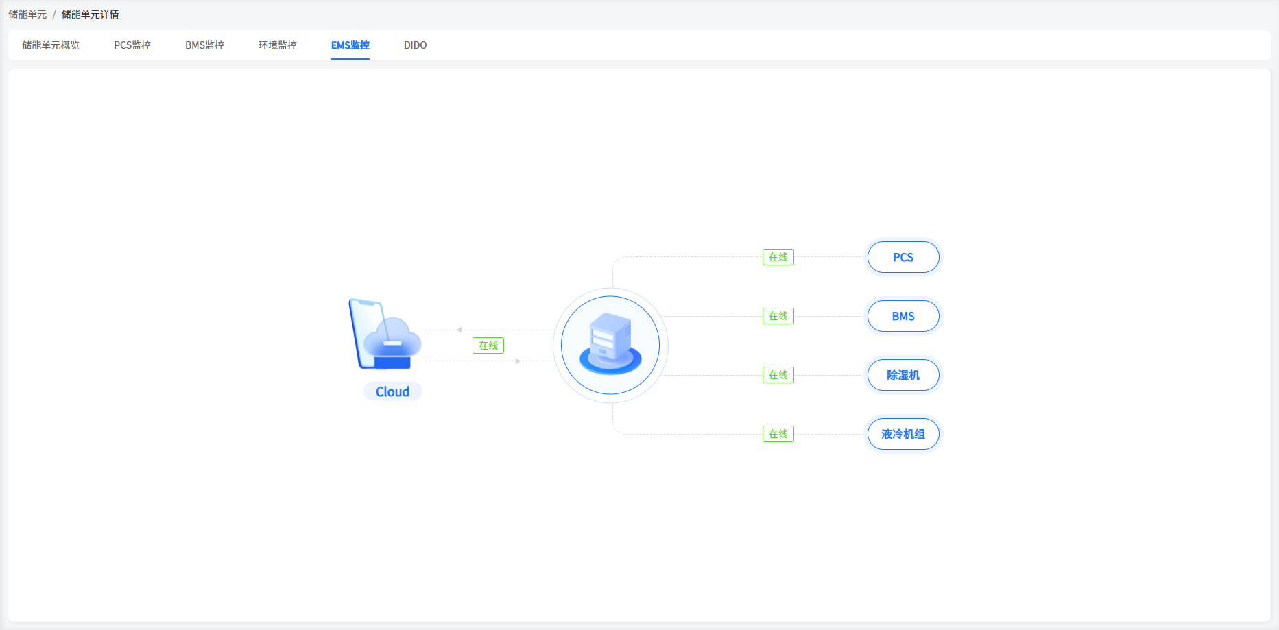 系统在EMS监控页面展示了设备与服务器之间的通信状态,以及PCS、BMS、除湿机和液冷机与EMS设备之间的通信状态。
