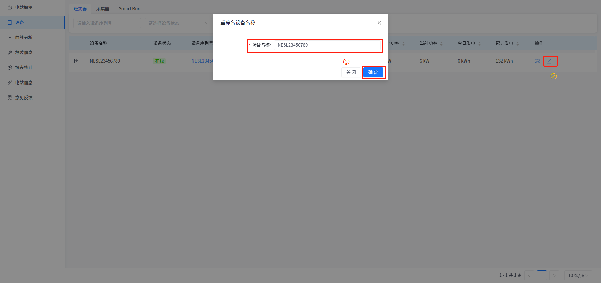 ③ 在弹出的重命名设备名称弹框中输入设备新名称,点击[确认]按钮。