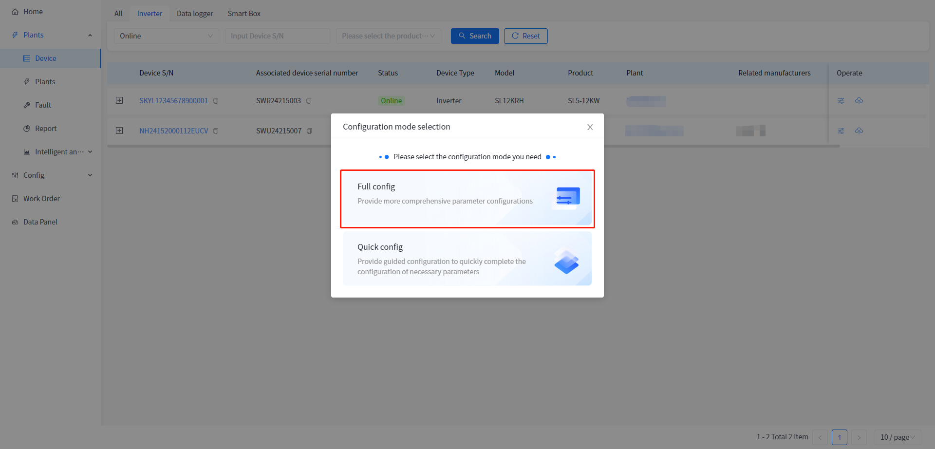② Click the [Parameter] button on the right. (If the device of this model supports quick configuration, then the configuration mode selection pop-up window will pop up after clicking the configuration button. If the device does not support quick configuration, the page will directly enter the parameter configuration page.)