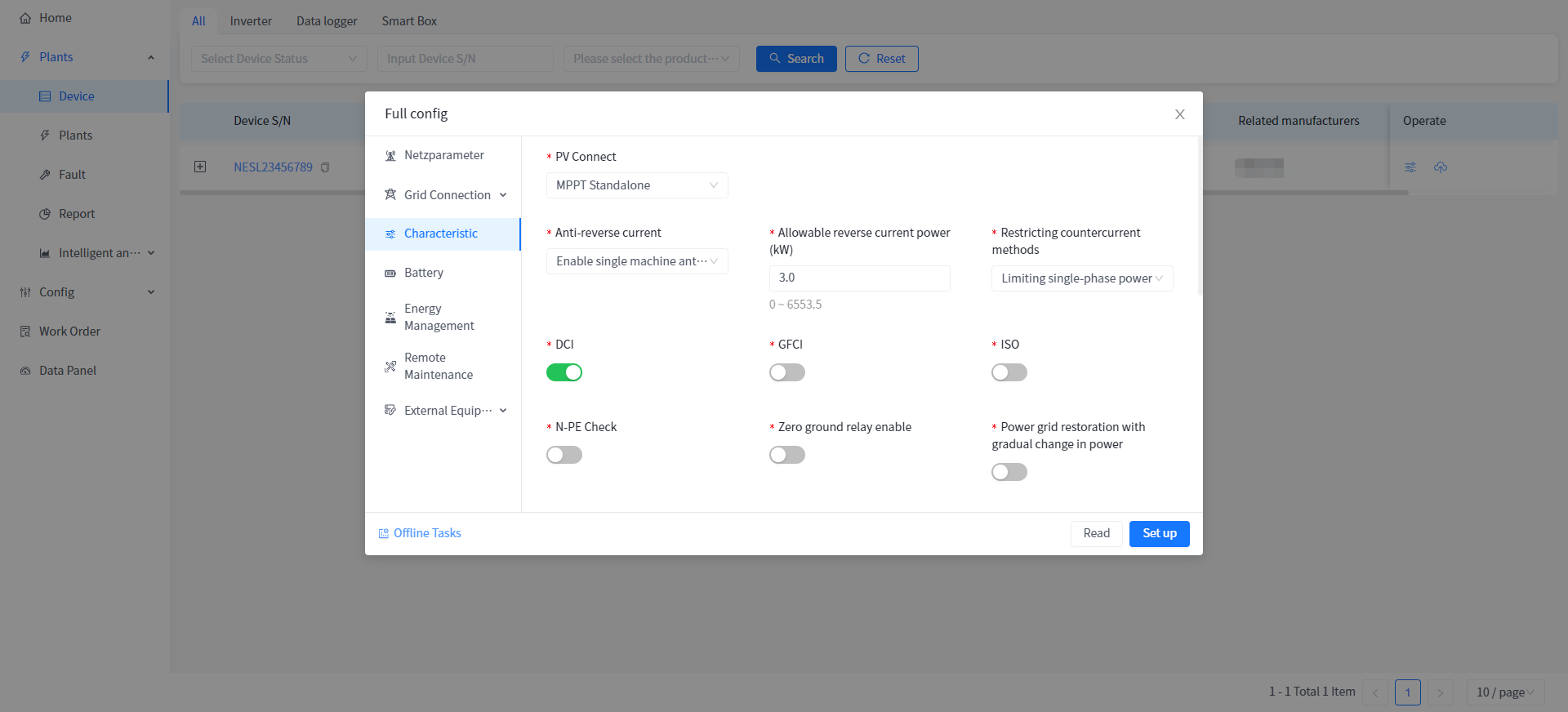 The system supports the operation of reading, setting and self-checking of equipment working parameters (only some models of equipment are supported) in the plant-equipment management.