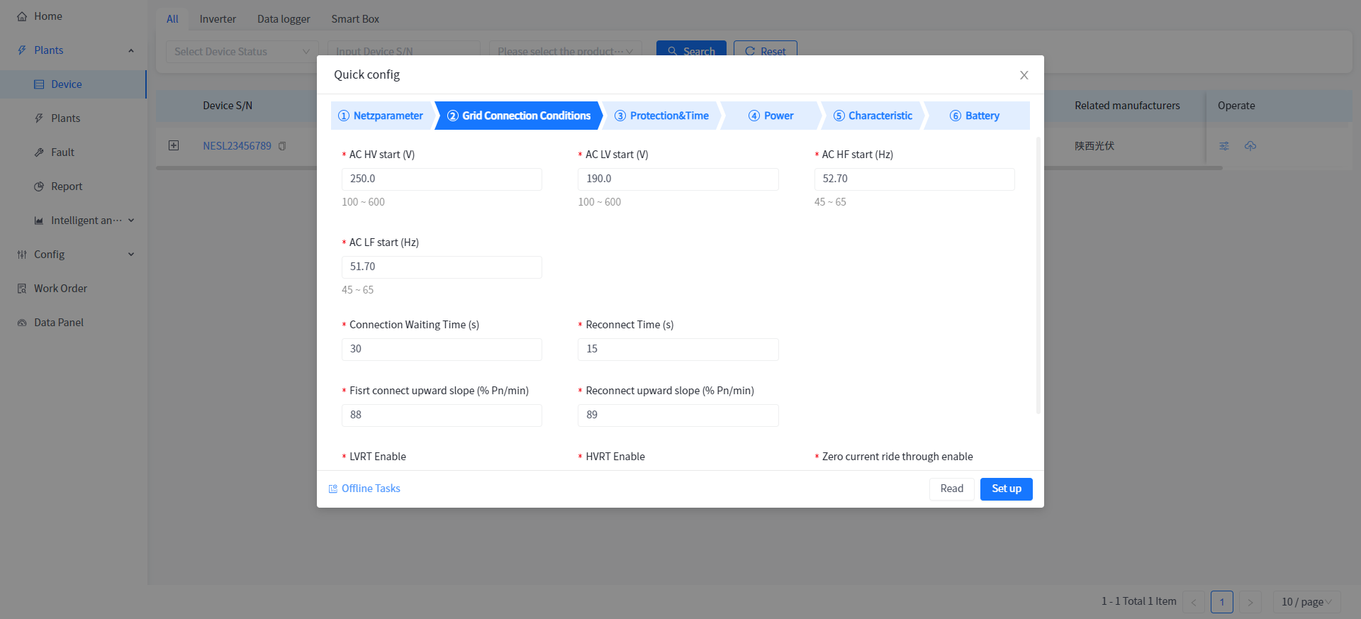 | Reconnect upward slope (% Pn/min) | The rate at which the machine tracks to the maximum power point of MPPT after reconnecting to the grid (setting regulations will automatically modify to the corresponding regulatory setting value, it is not recommended for users to modify) | 1-65535,minimum unit 1X%Pn/min |
