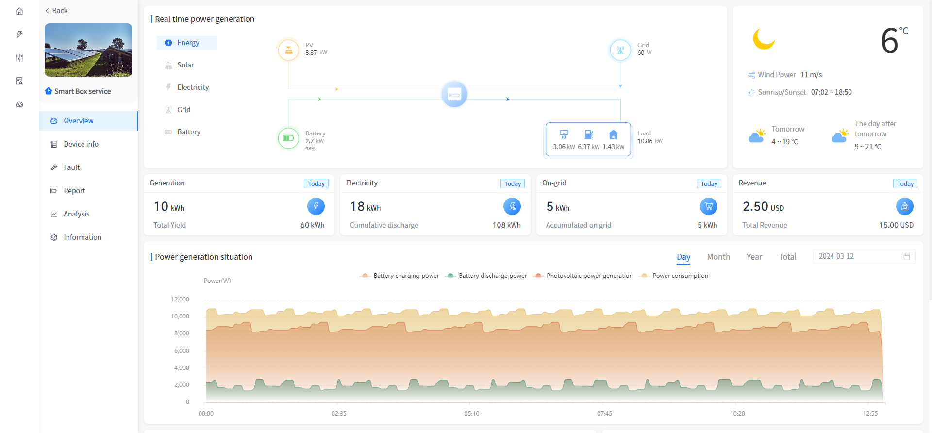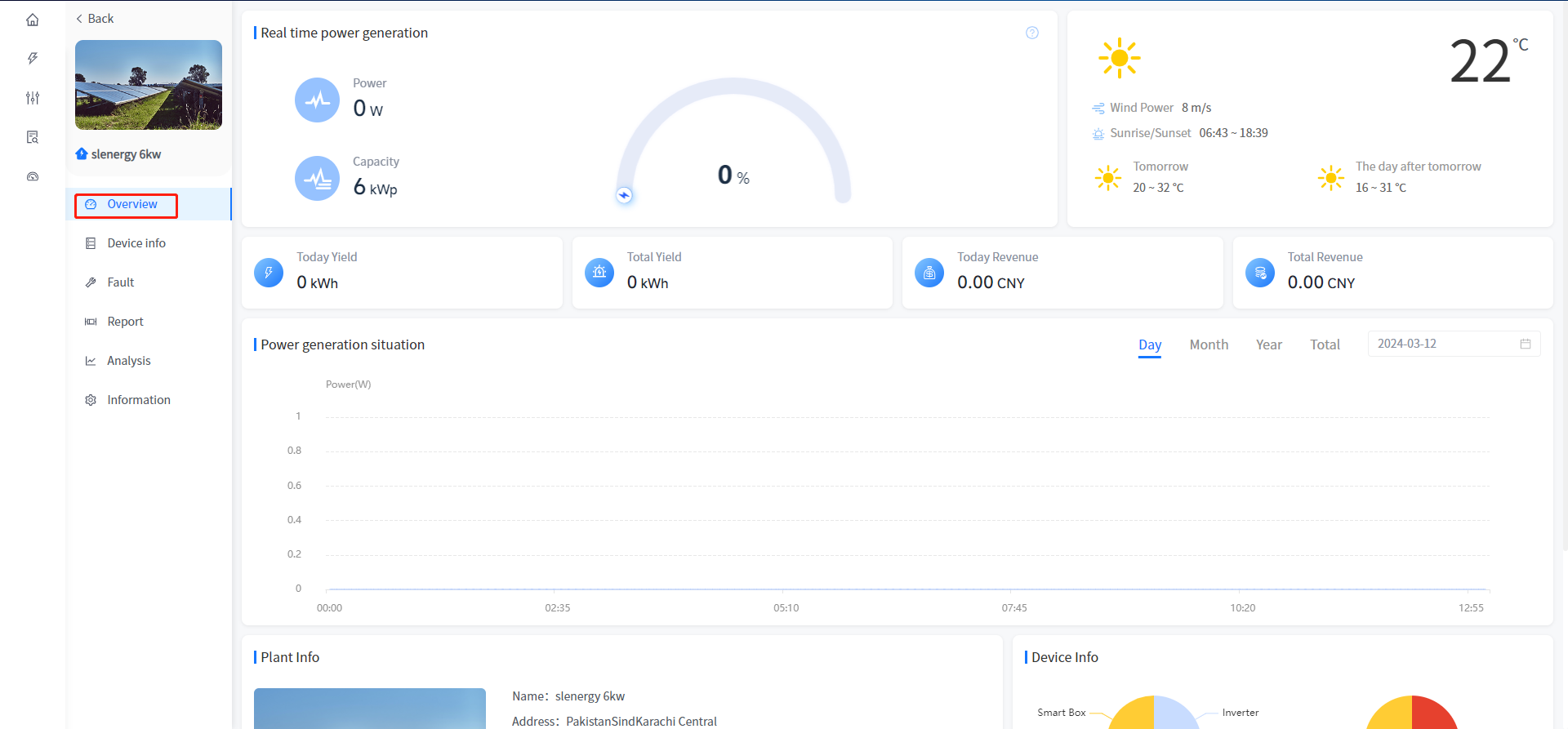 [Solar] Displays the current power of the plant, the total installed power, the power generation value, today's power generation, this month's power generation, this year's power generation and cumulative power generation.