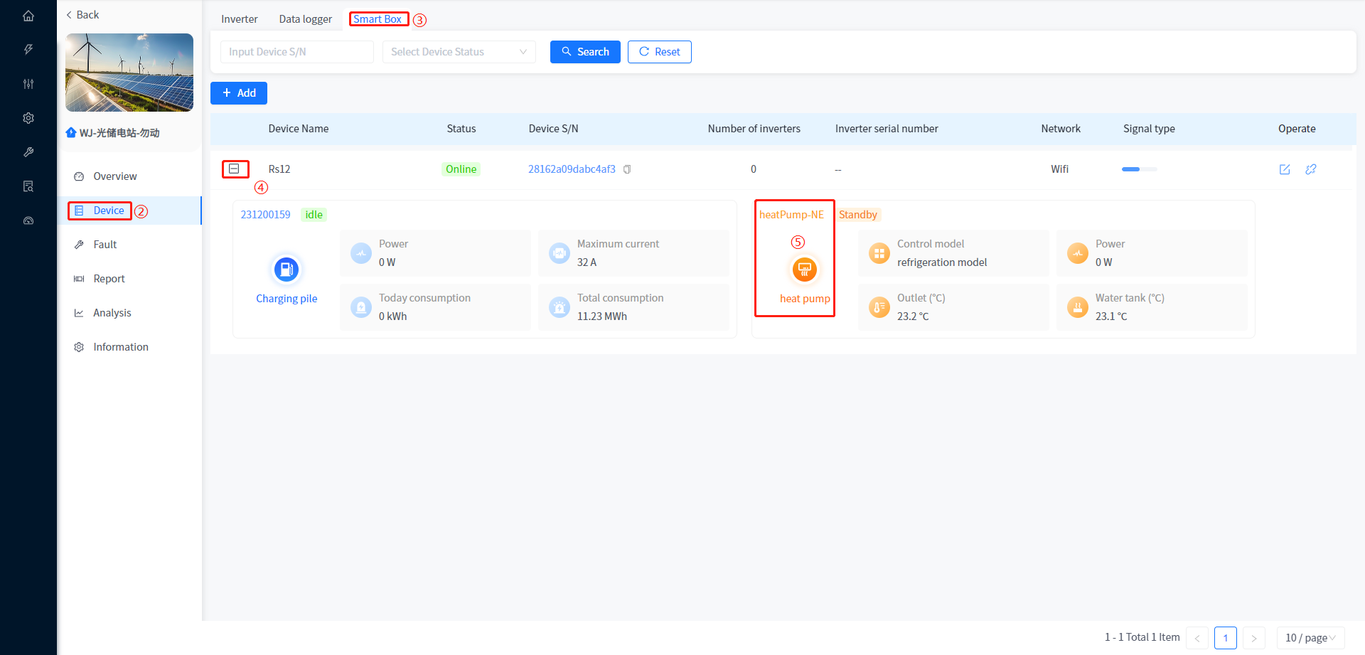 ⑤ Click on the heat pump icon or serial number to enter the detailed information page of the charging station.