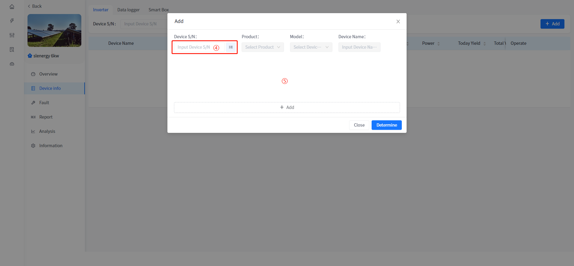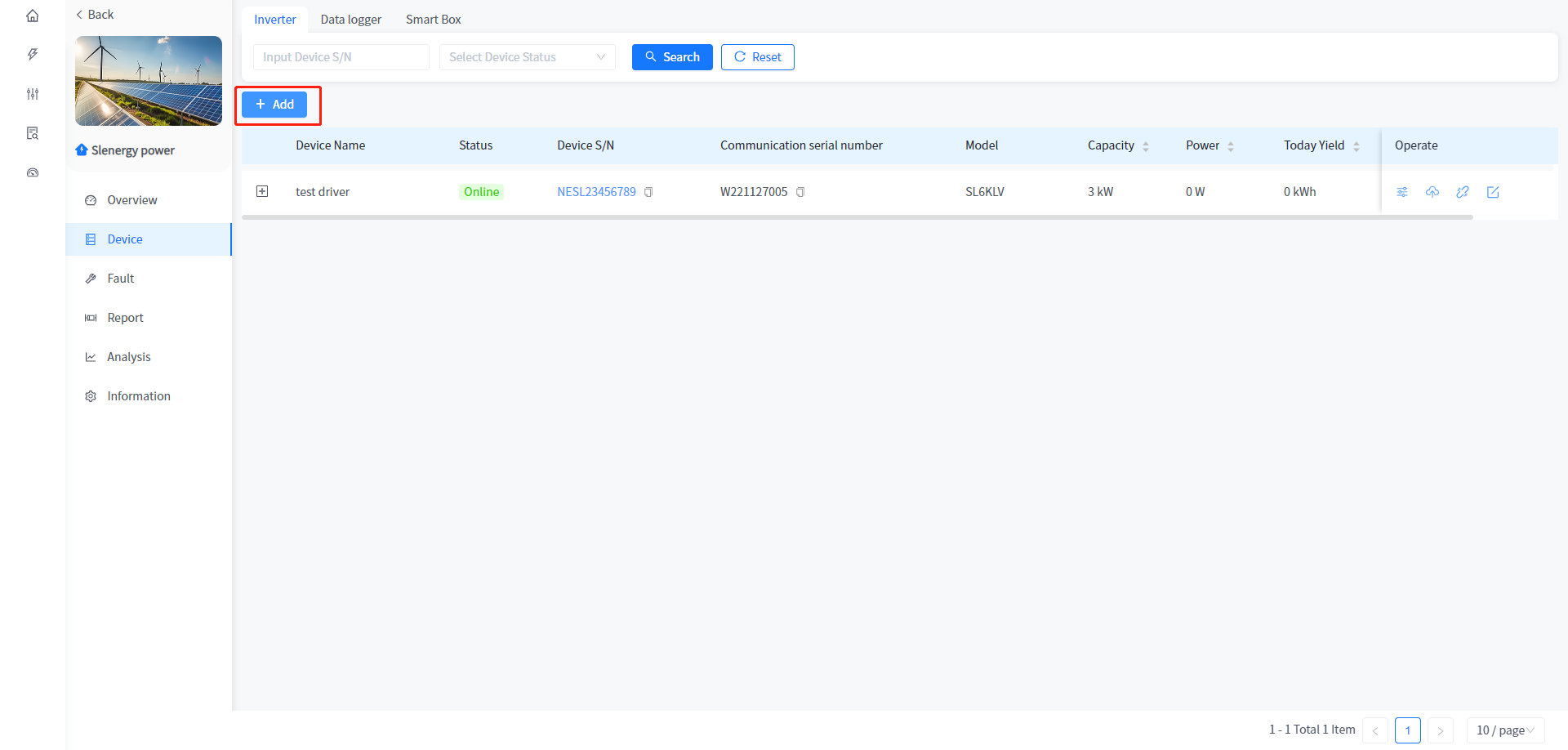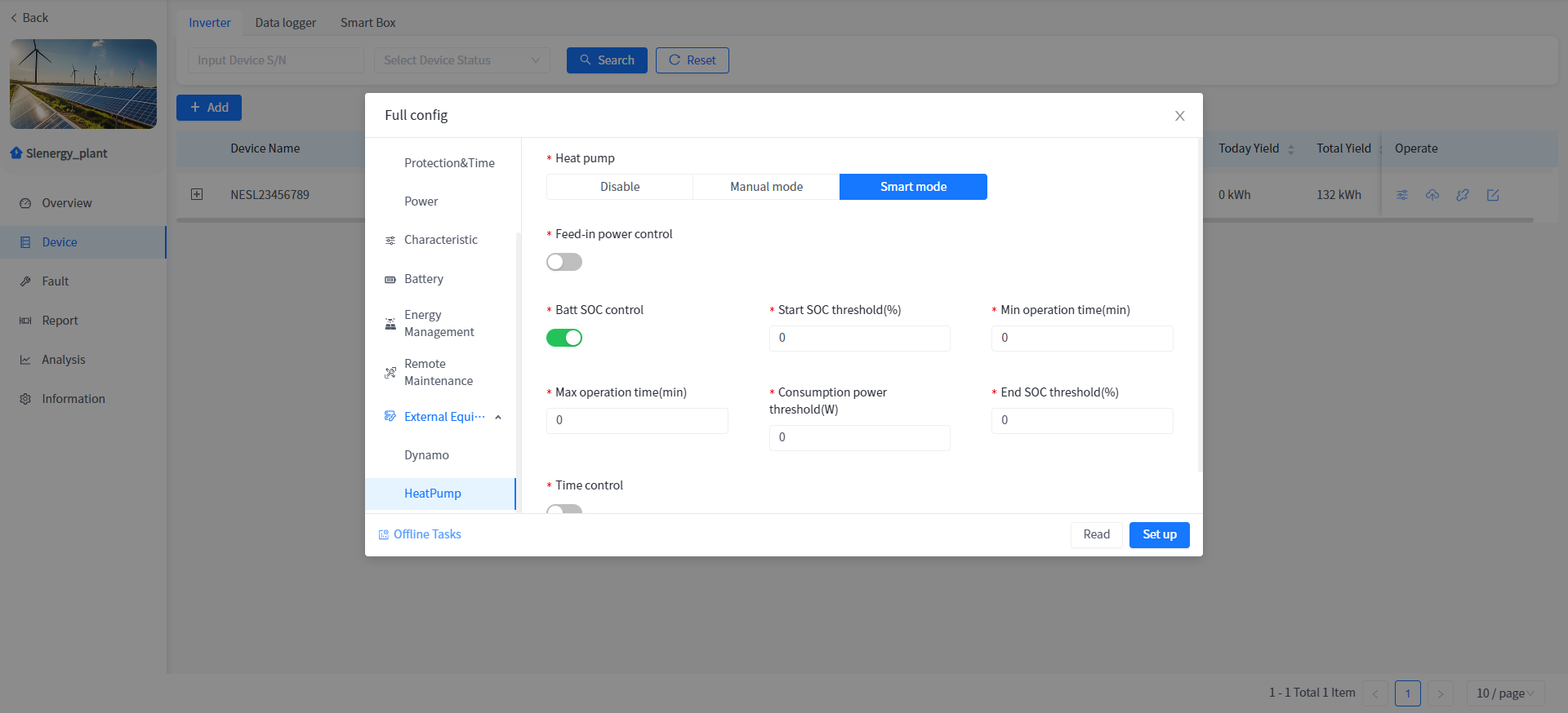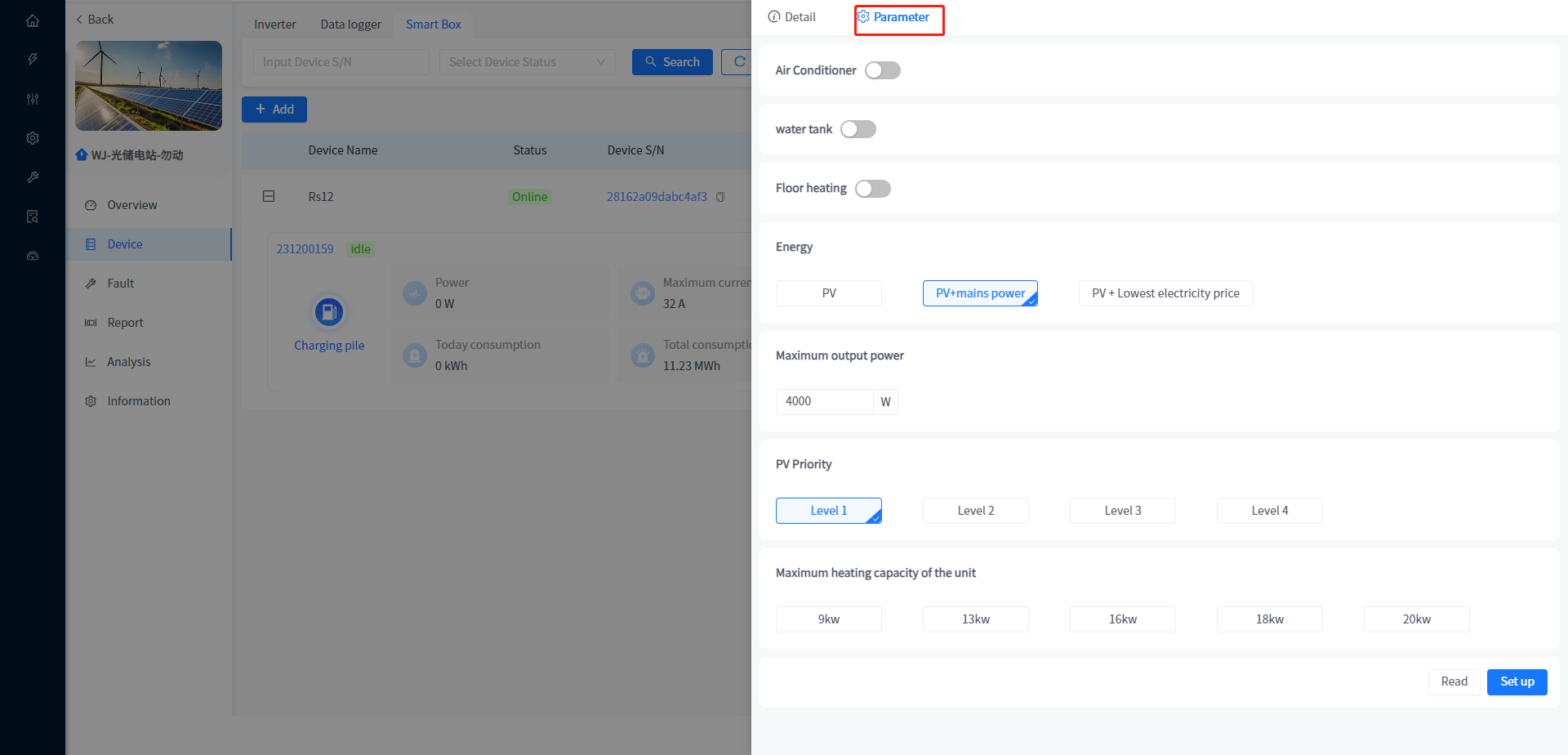 Add and associate Plants to Smart Box devices, as well as view data and configure parameters for associated heat pumps and charging stations under Smart Box. The addition of Smart Box devices is consistent with the addition of devices associated with the Plant, such as inverters.