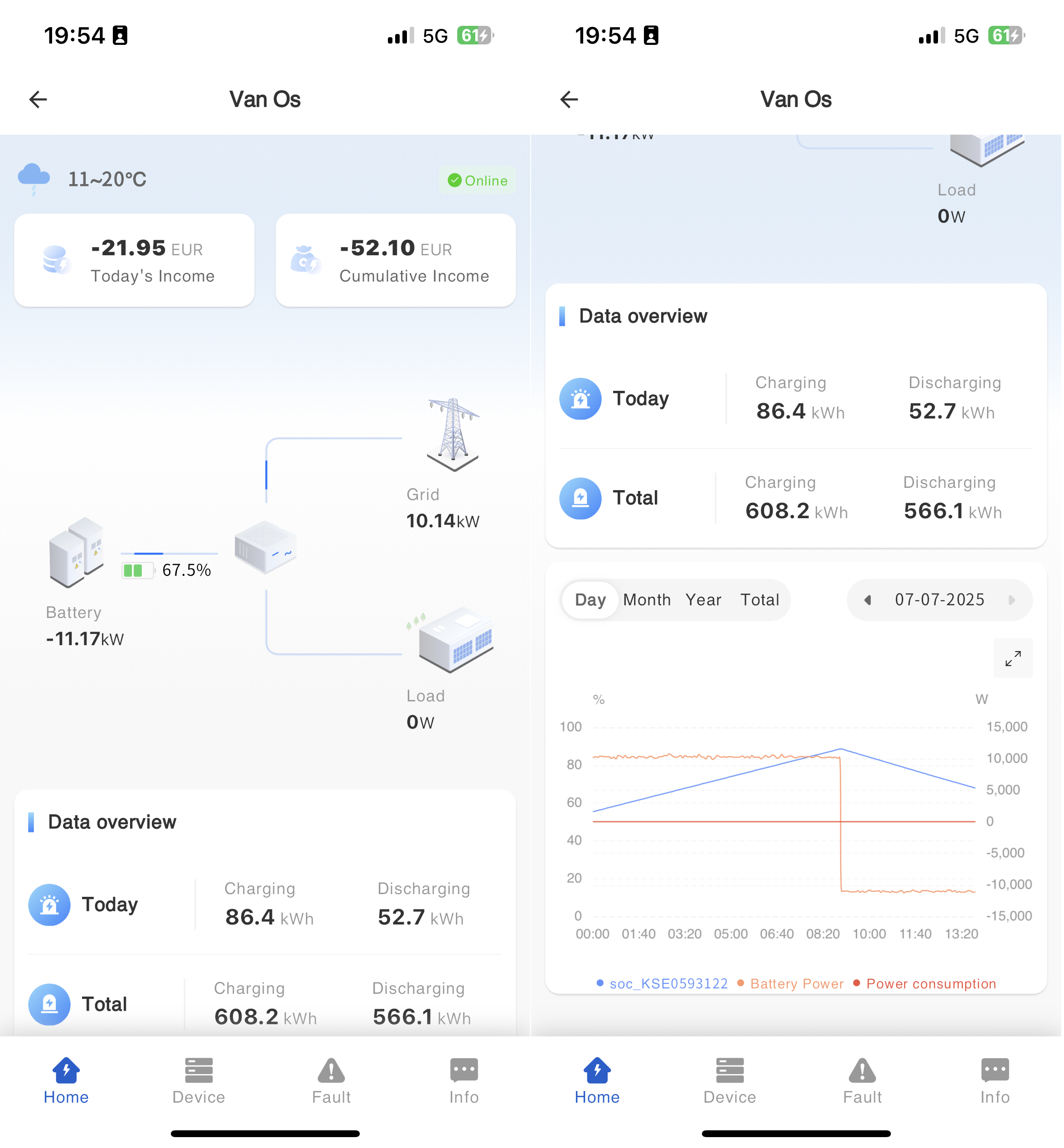[Statistics of Cabinet Operation] Display the SOC of all BMS cabinets in the current power station, the sum of battery power of all BMS cabinets, the sum of load power consumption, and the sum of photovoltaic power generation. Monthly, annual, and cumulative dimensions display the charging, discharging, revenue, power generation, and load power consumption of all cabinets.