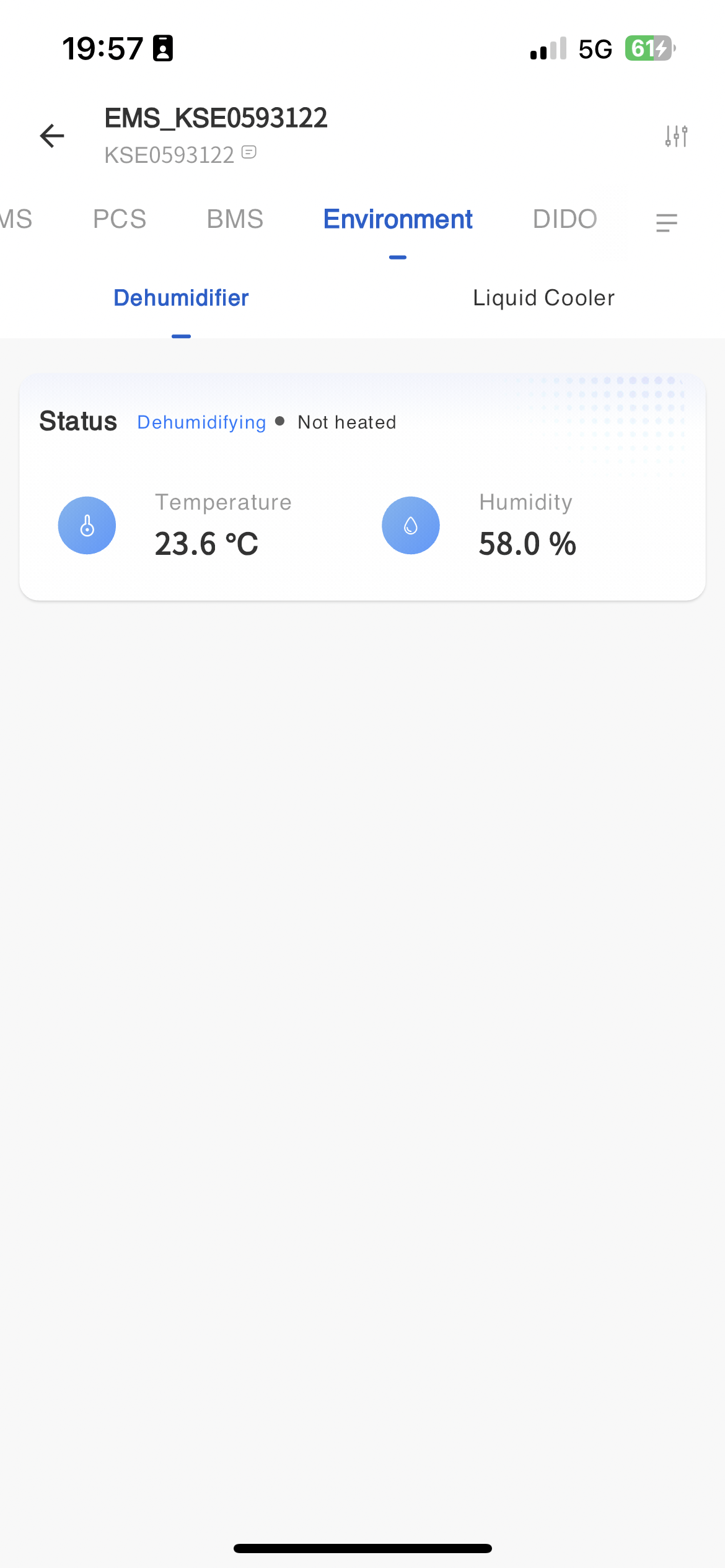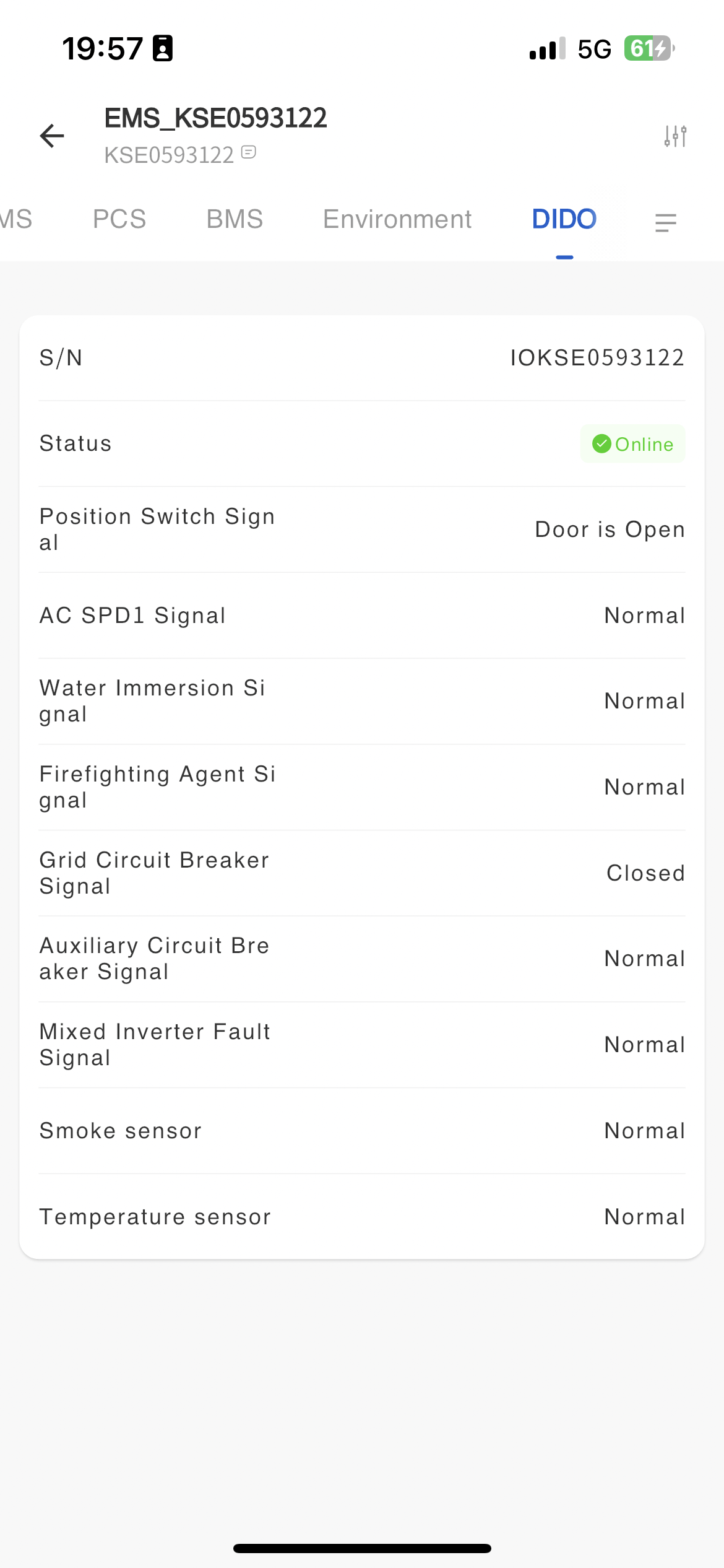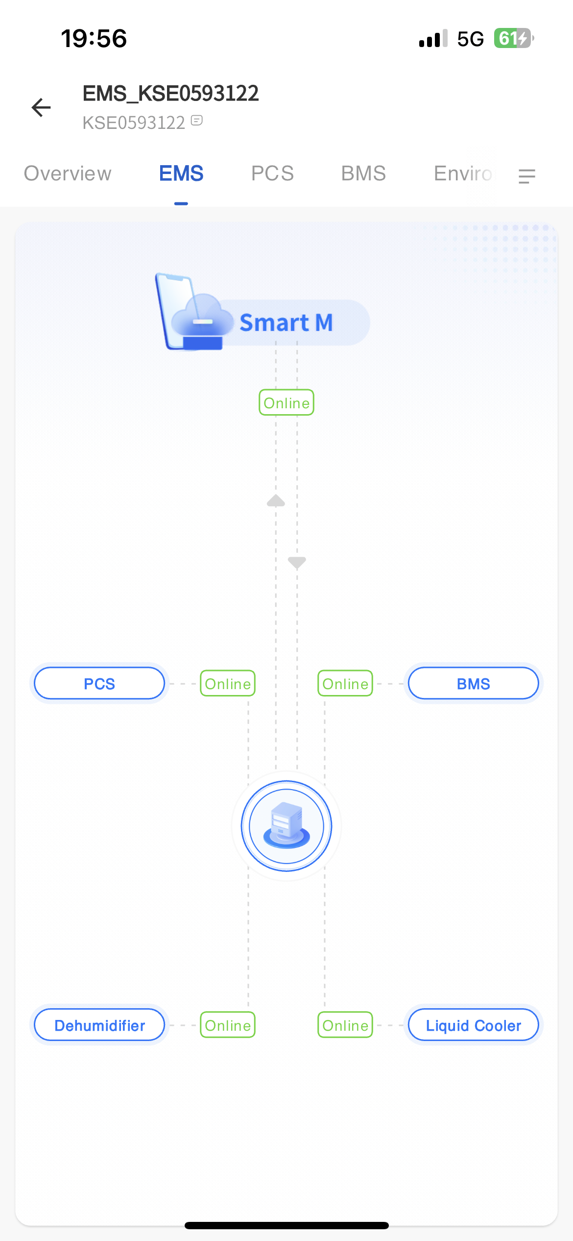 The system displays the communication status between devices and servers on the EMS monitoring page, as well as the communication status between PCS, BMS, dehumidifiers, and liquid coolers and EMS devices.