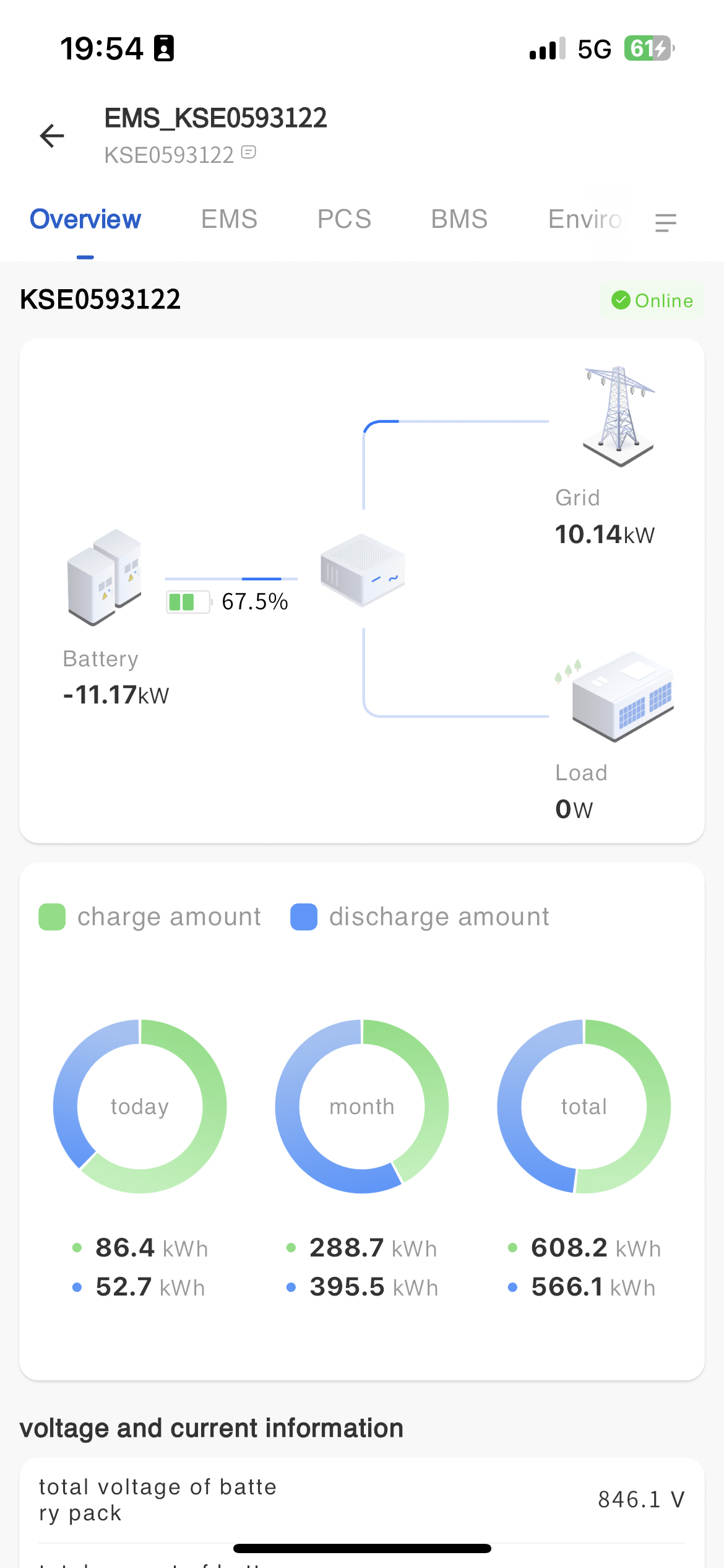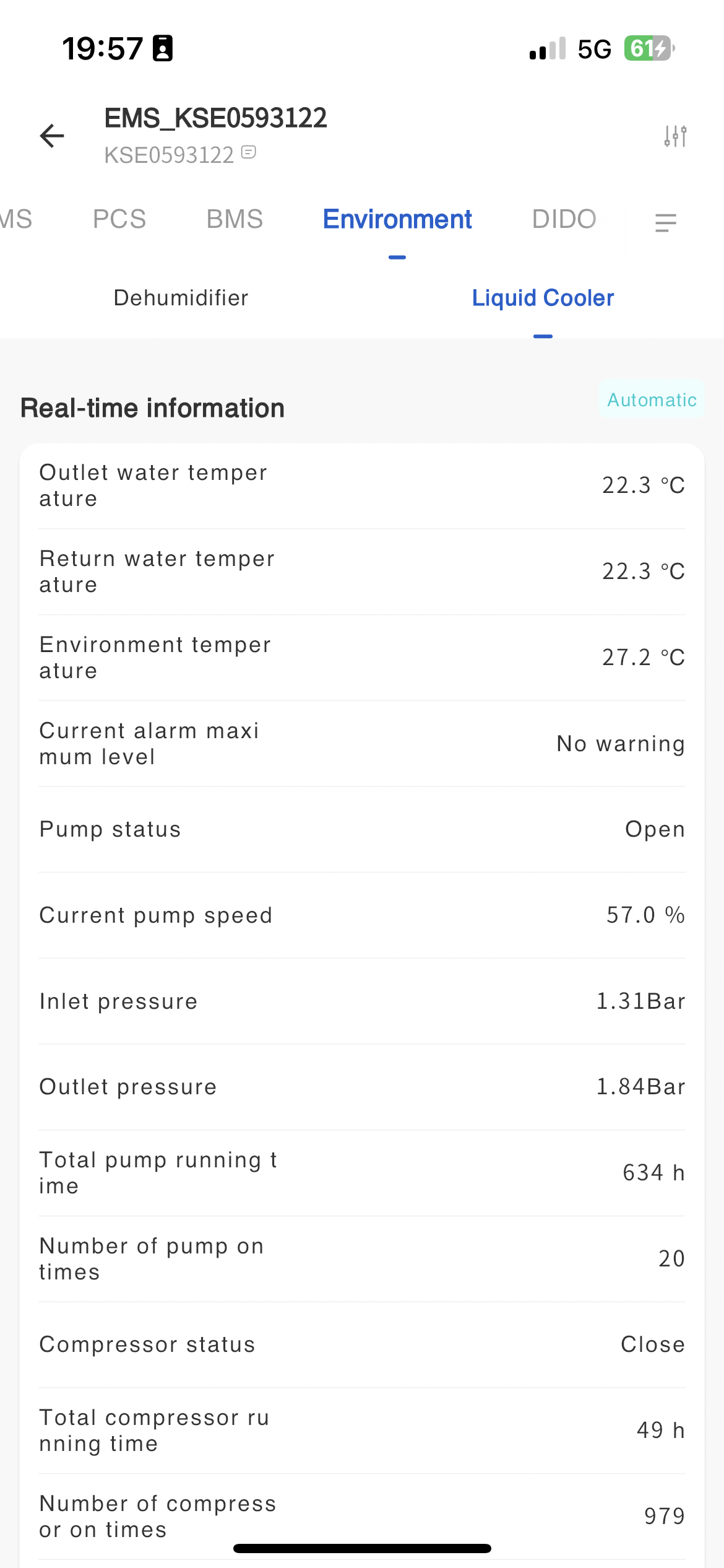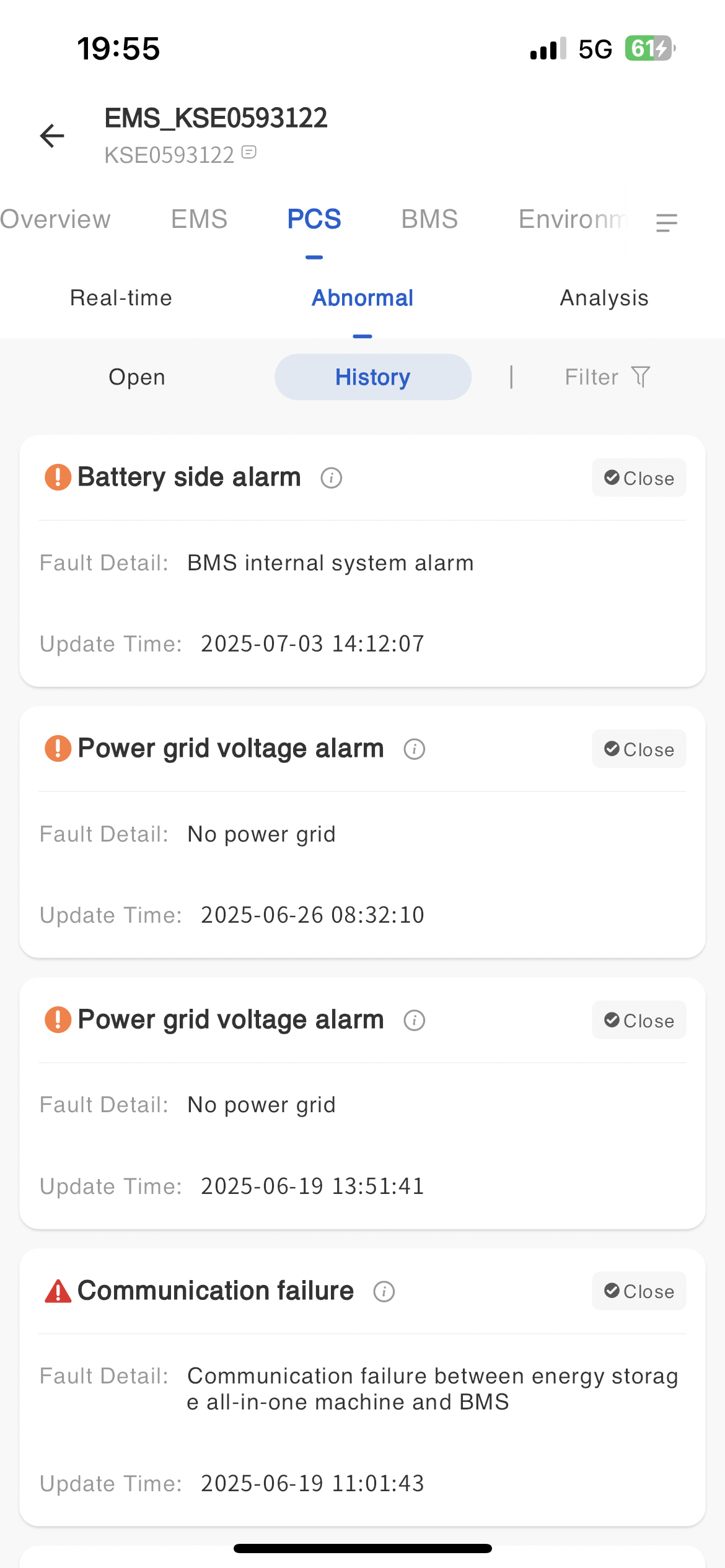 The system displays the communication status between devices and servers on the EMS monitoring page, as well as the communication status between PCS, BMS, dehumidifiers, and liquid coolers and EMS devices.