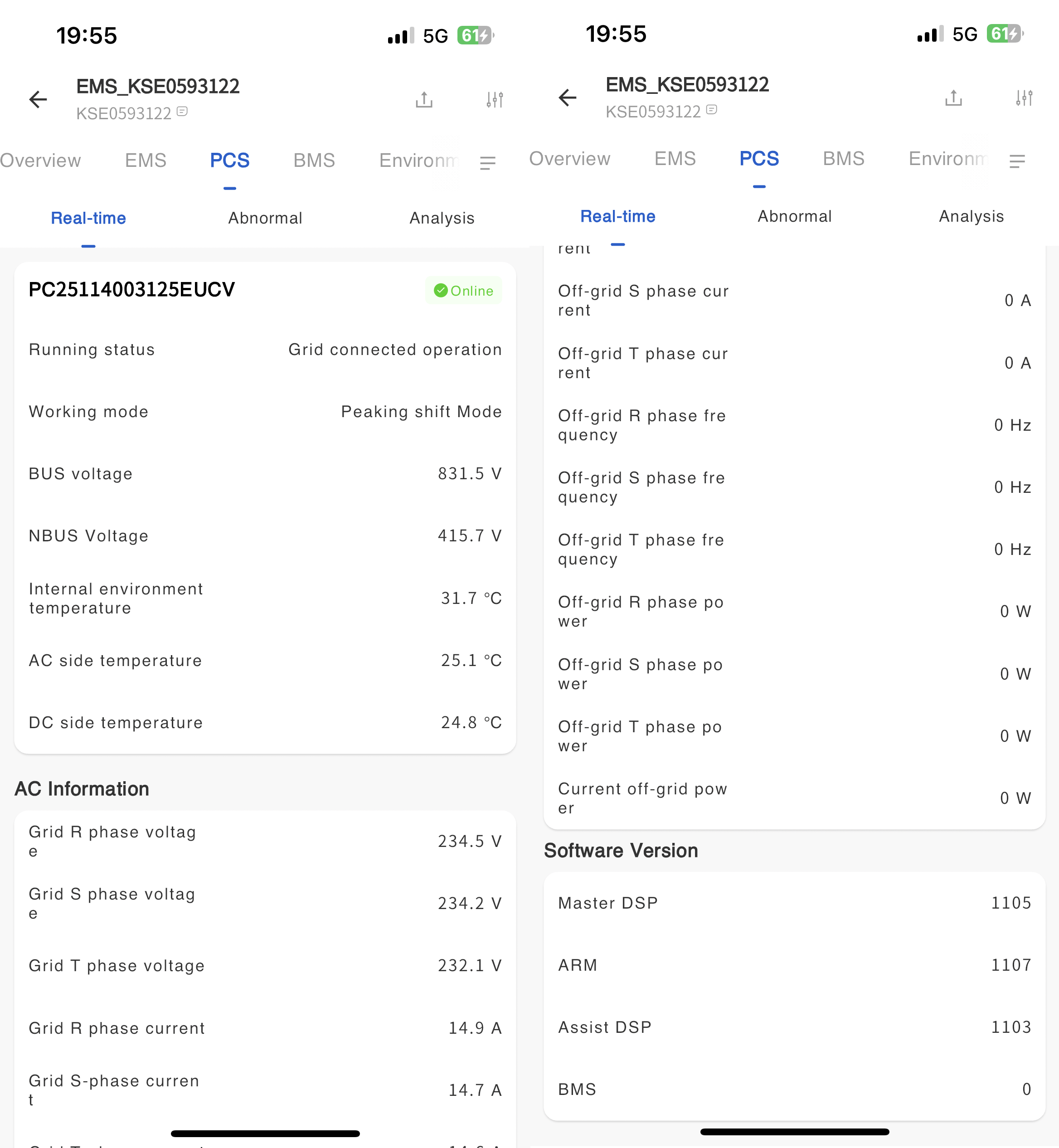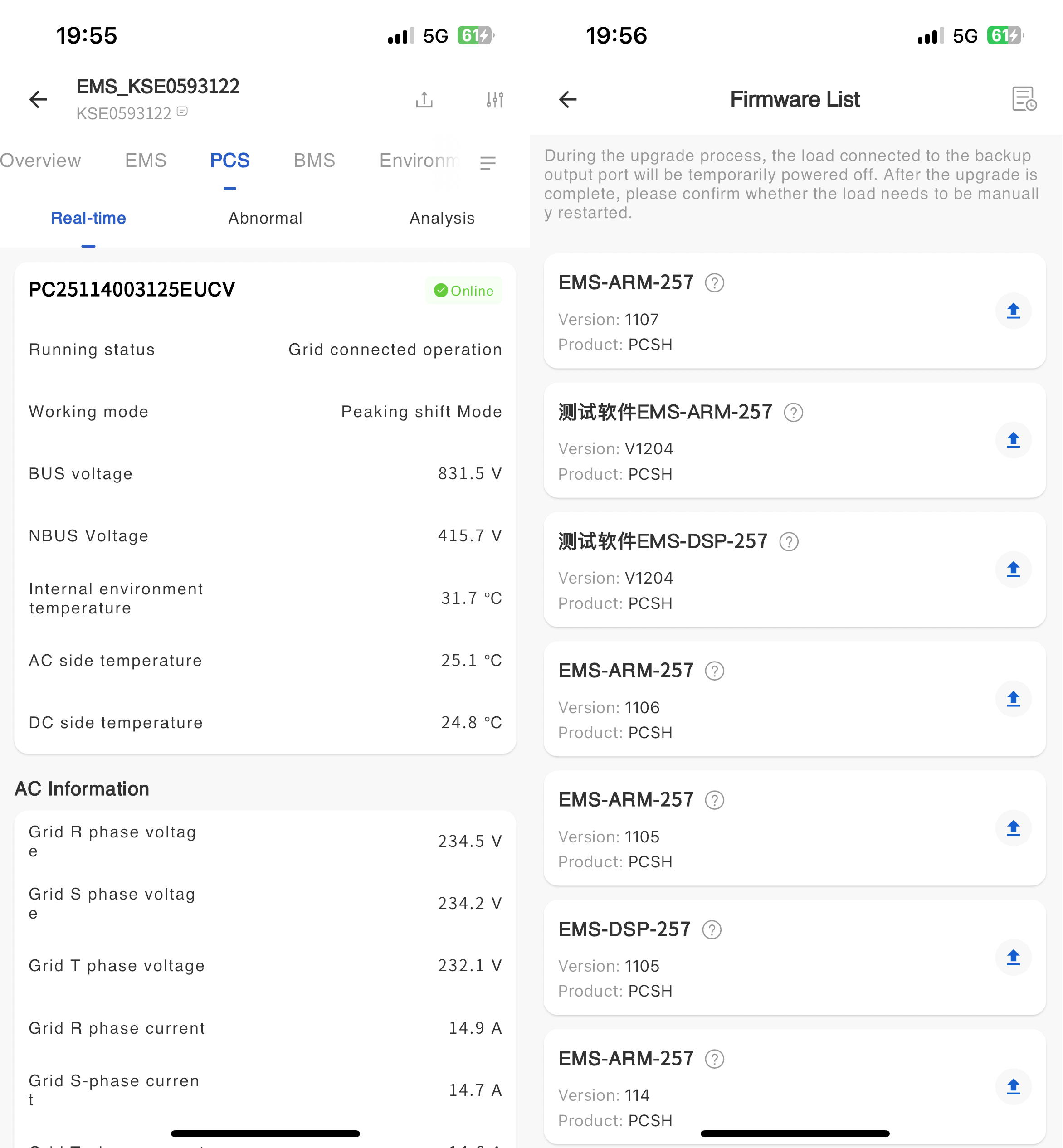 You can upgrade the firmware version of the PCS devices in the cabinet on the APP.