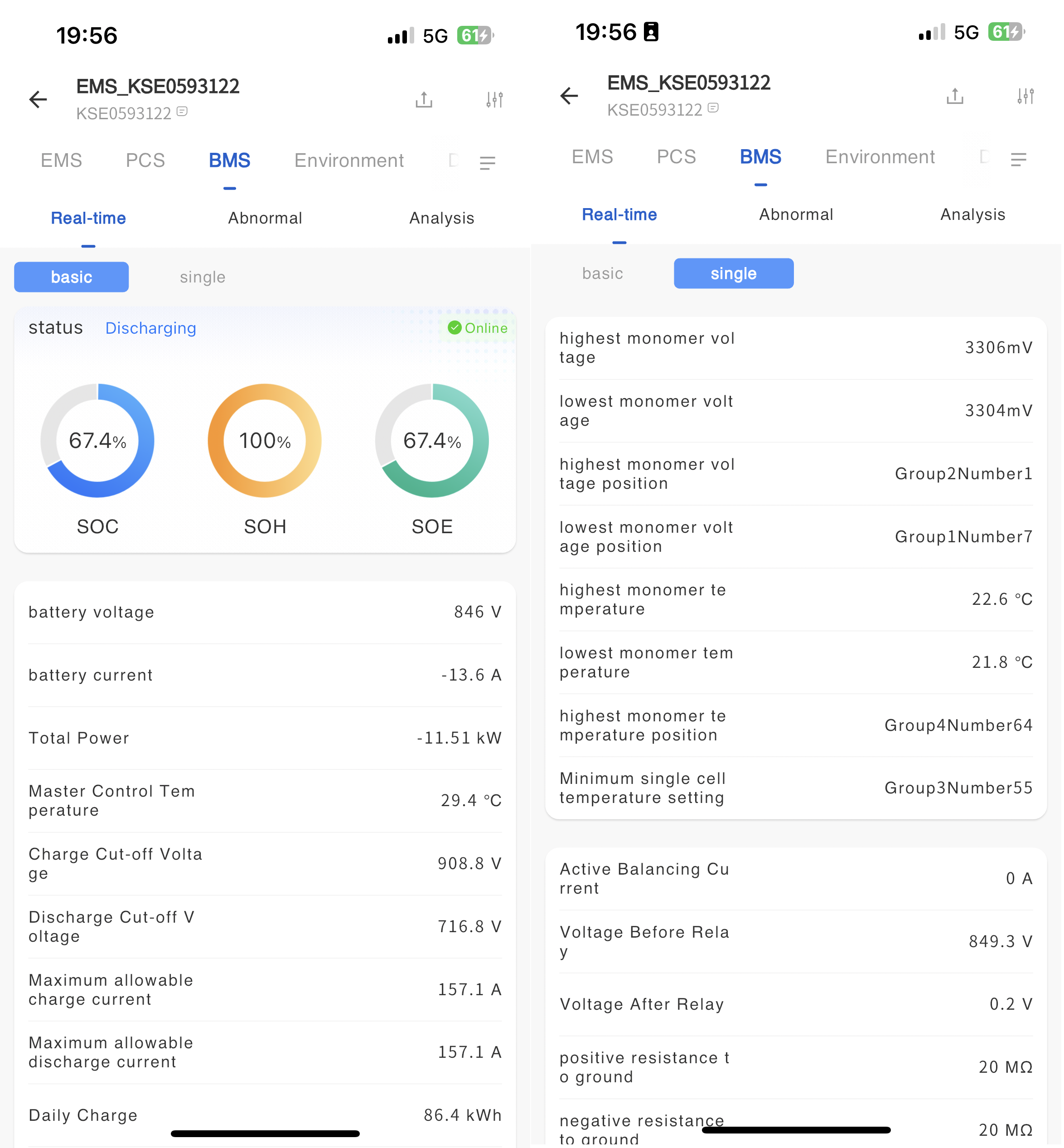 The BMS real-time information page displays detailed operational data of the batteries in the cabinet, such as basic operational information, operational status, individual cell operational information, and detailed operational data of individual cells.