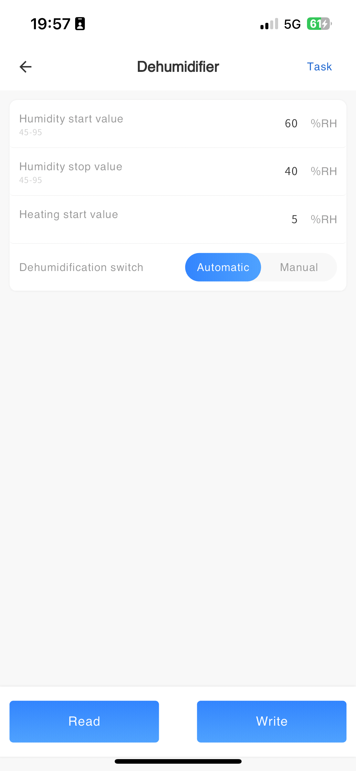 Remote reading and setting of dehumidifier parameters.