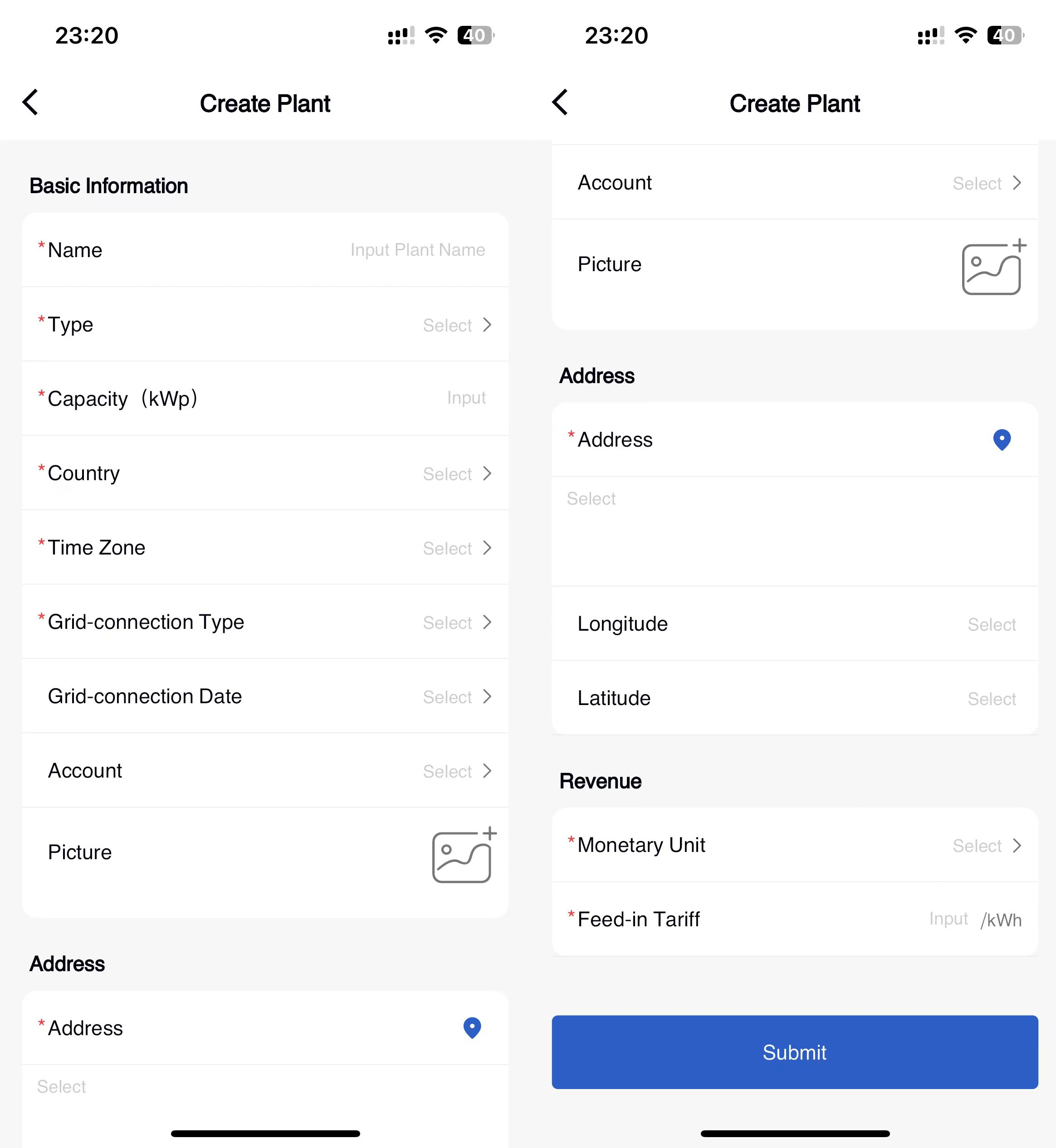 You can click the button in the bottom right corner of the homepage and Plant list to enter the information input page. After filling in the information that meets the rules on the information input page, click [Submit], and the Plant will be created after a successful prompt.