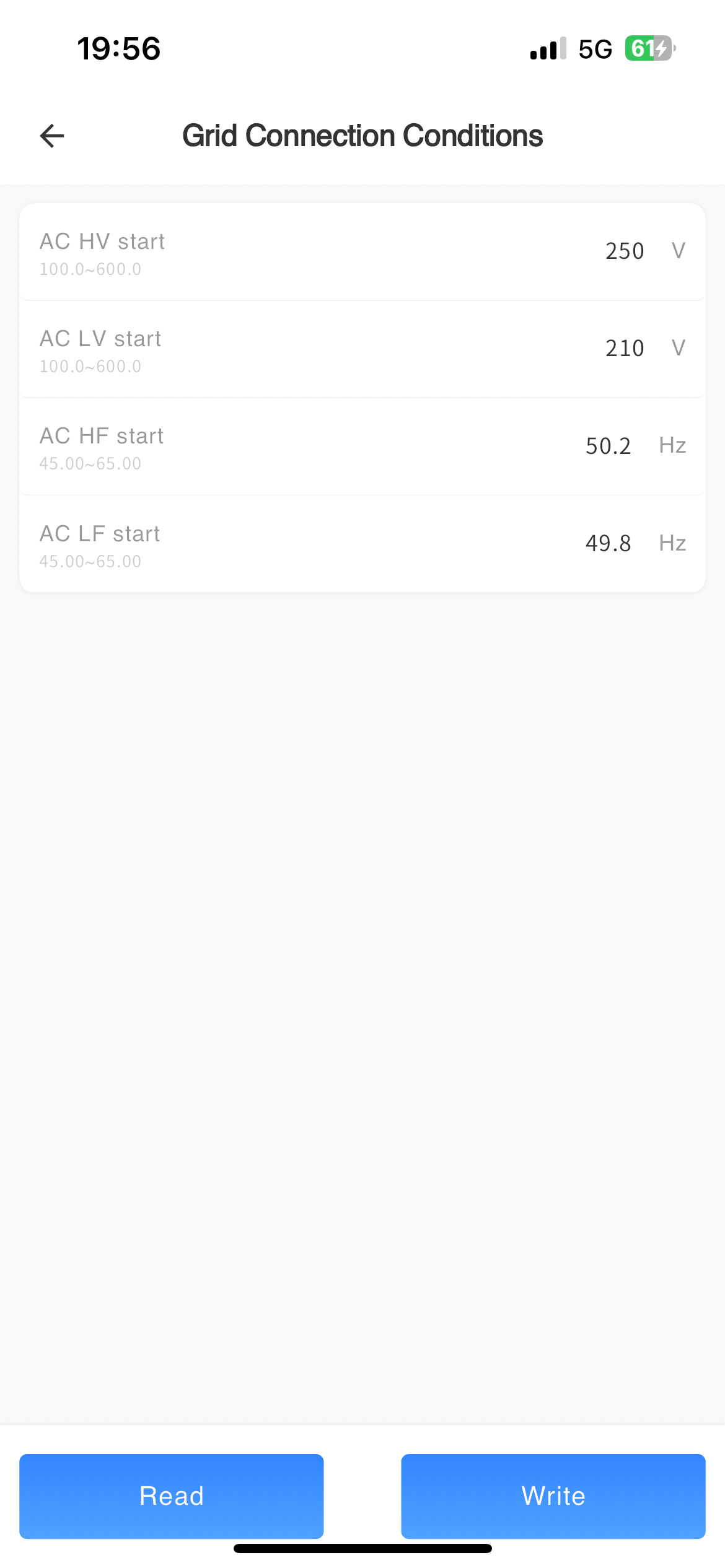 AC startup low frequency(Hz) | The minimum mains frequency at which a machine can connect to the grid. If the machine detects that the mains voltage is lower than this frequency before grid connection, it will not be able to connect to the grid (the regulations will be automatically modified to the corresponding regulatory settings, and it is not recommended for users to modify) | 45Hz-65Hz,Minimum Unit 0.01Hz |