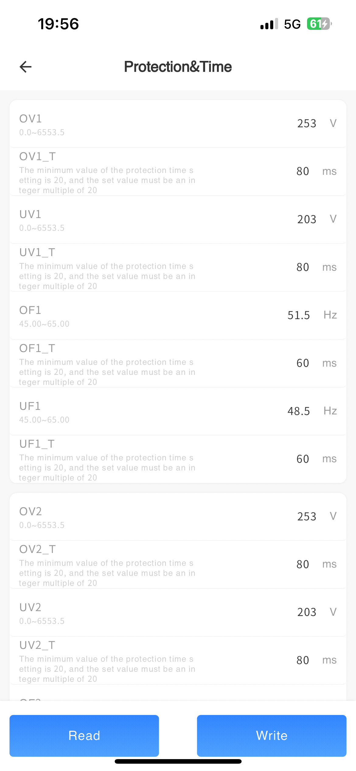 OV1_T (ms) | The time taken from level 1 overvoltage of the mains power to machine protection (the setting of regulations will automatically modify to the corresponding regulatory setting value, and it is not recommended for users to modify) | Minimum 20ms |