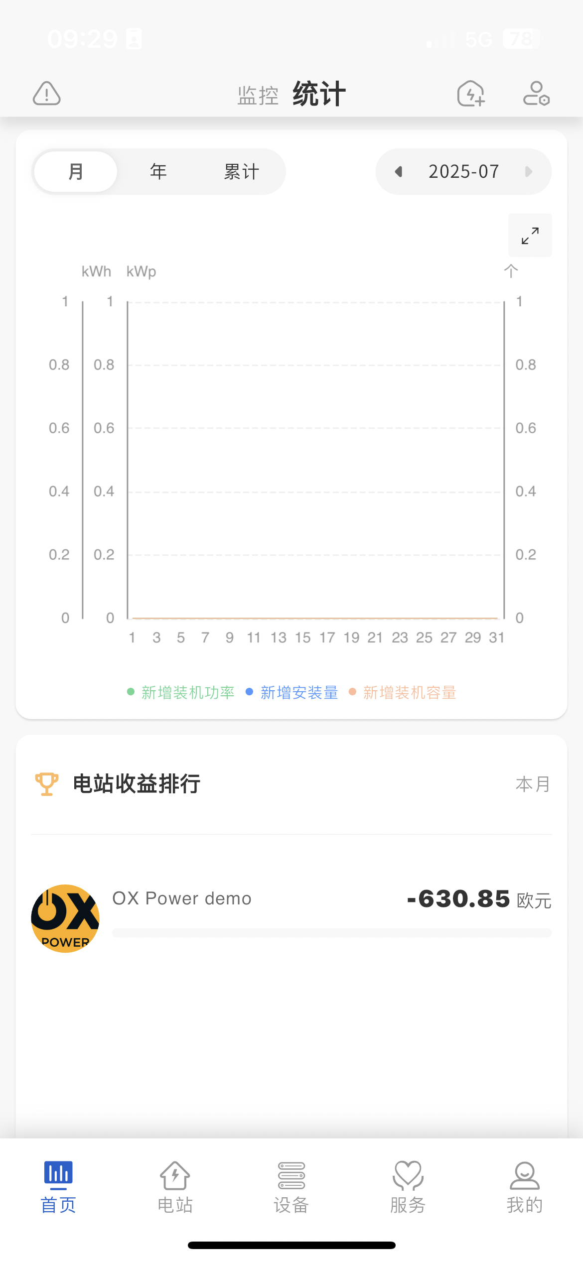 [月] 展示您公司在当前月份每一天的装机量、装机功率和装机容量之和统计图