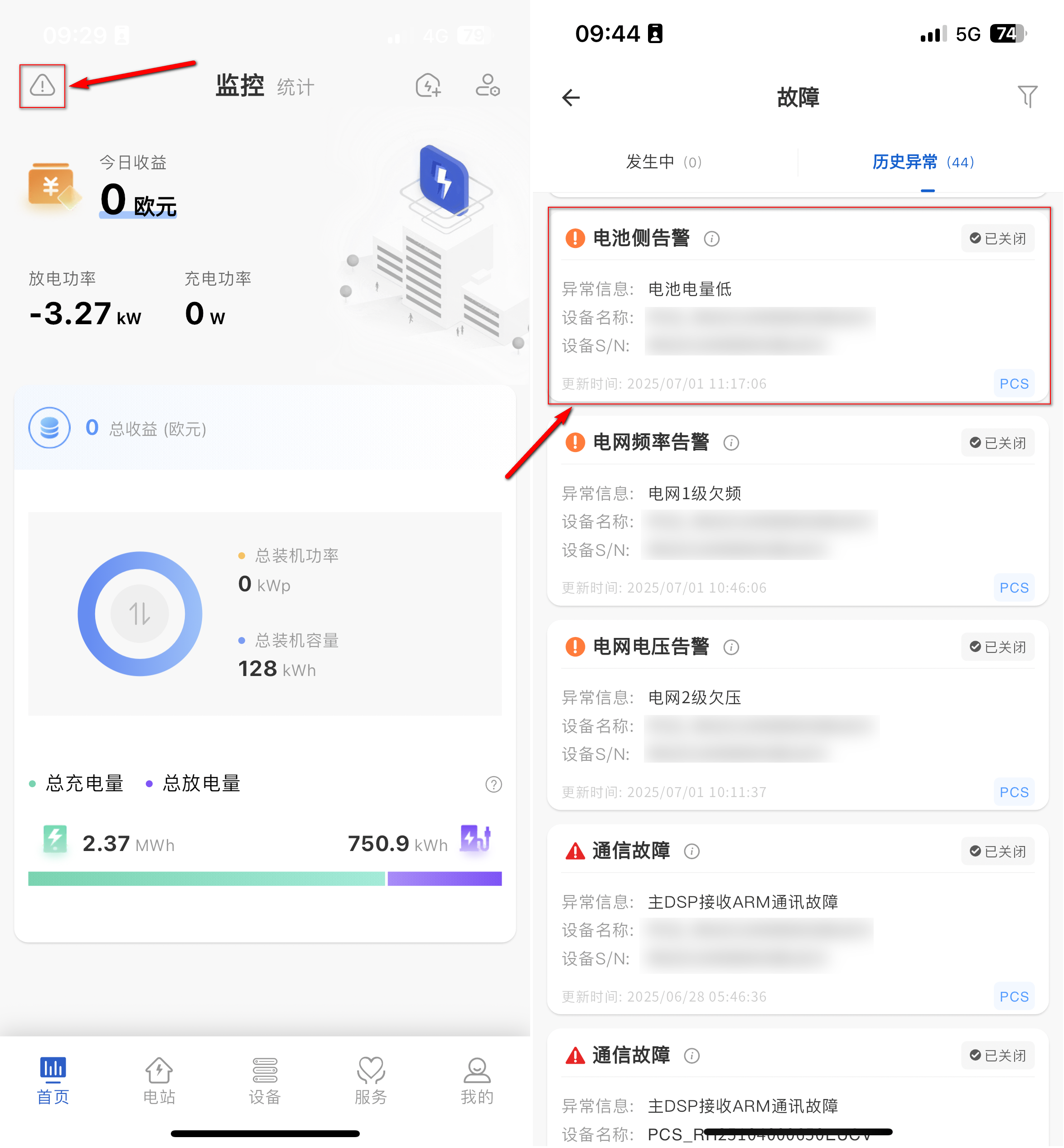 点击首页中的按钮查看所有与您关联电站下的设备故障数据(默认展示的是正在发生中的故障)。