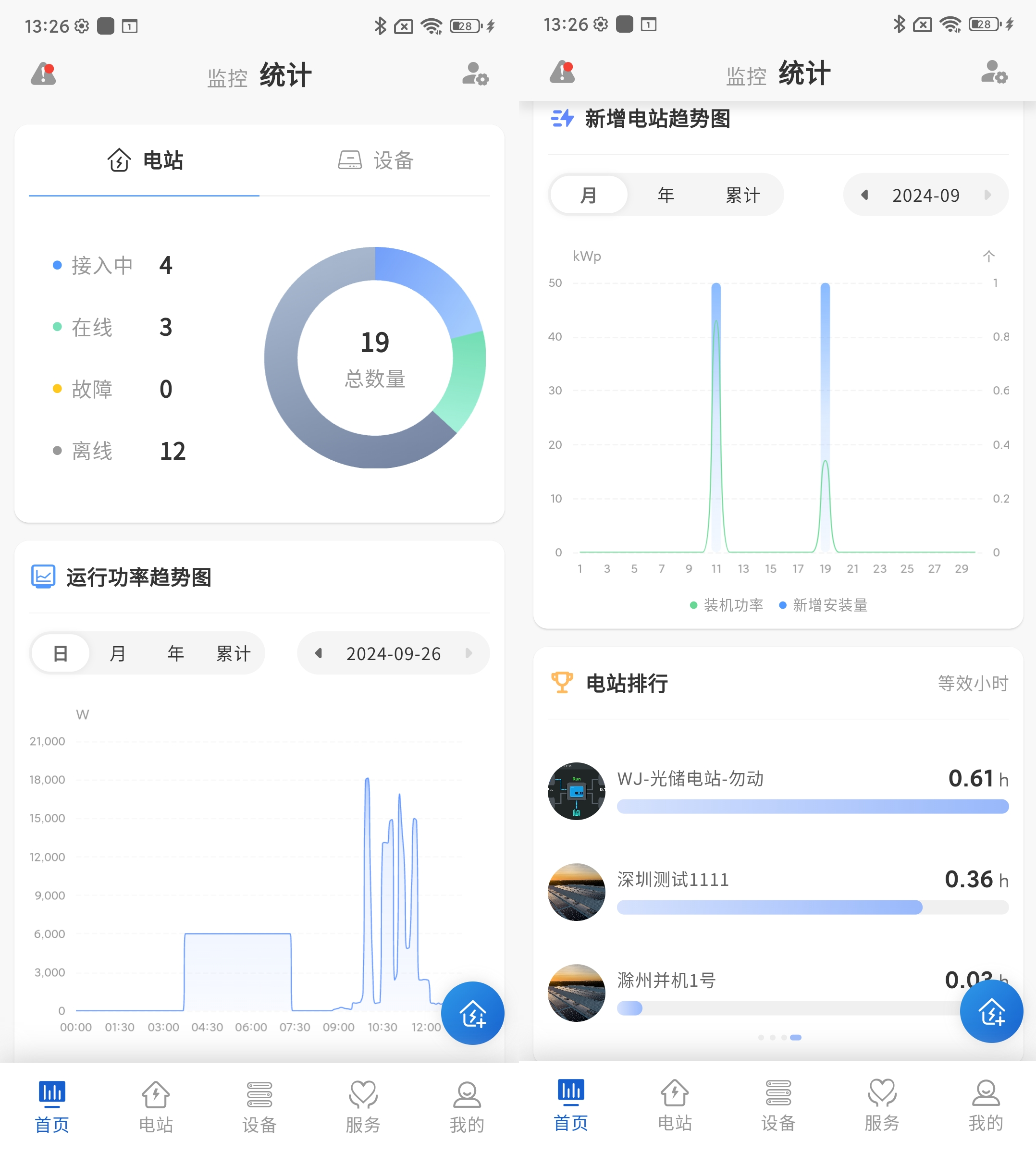 [电站]数据状态直接展示与您关联所有电站的状态。点击统计数据中的状态,跳转到电站模块中的该状态分类中。