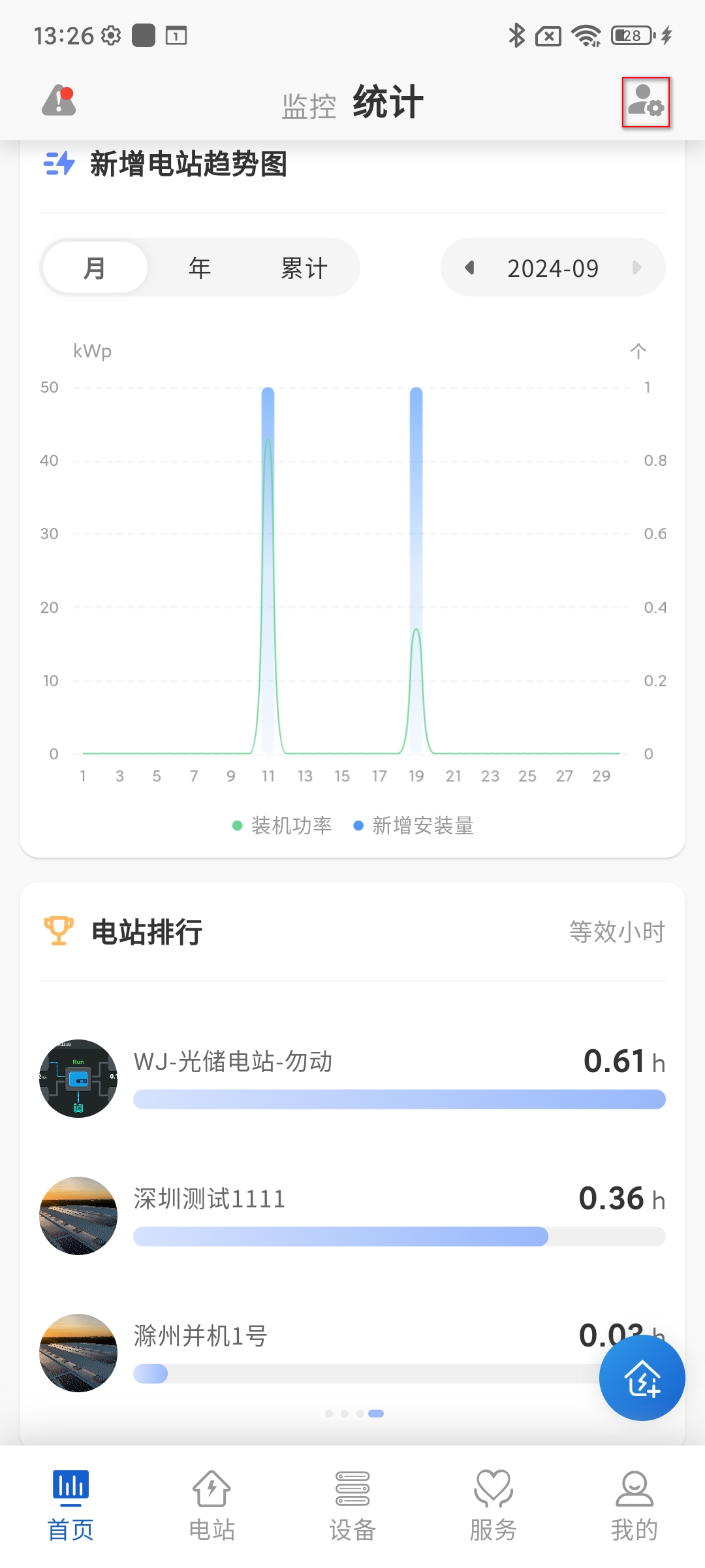 点击首页右上角 按钮可以快速进入创建电站页面。具体操作步骤见创建电站。