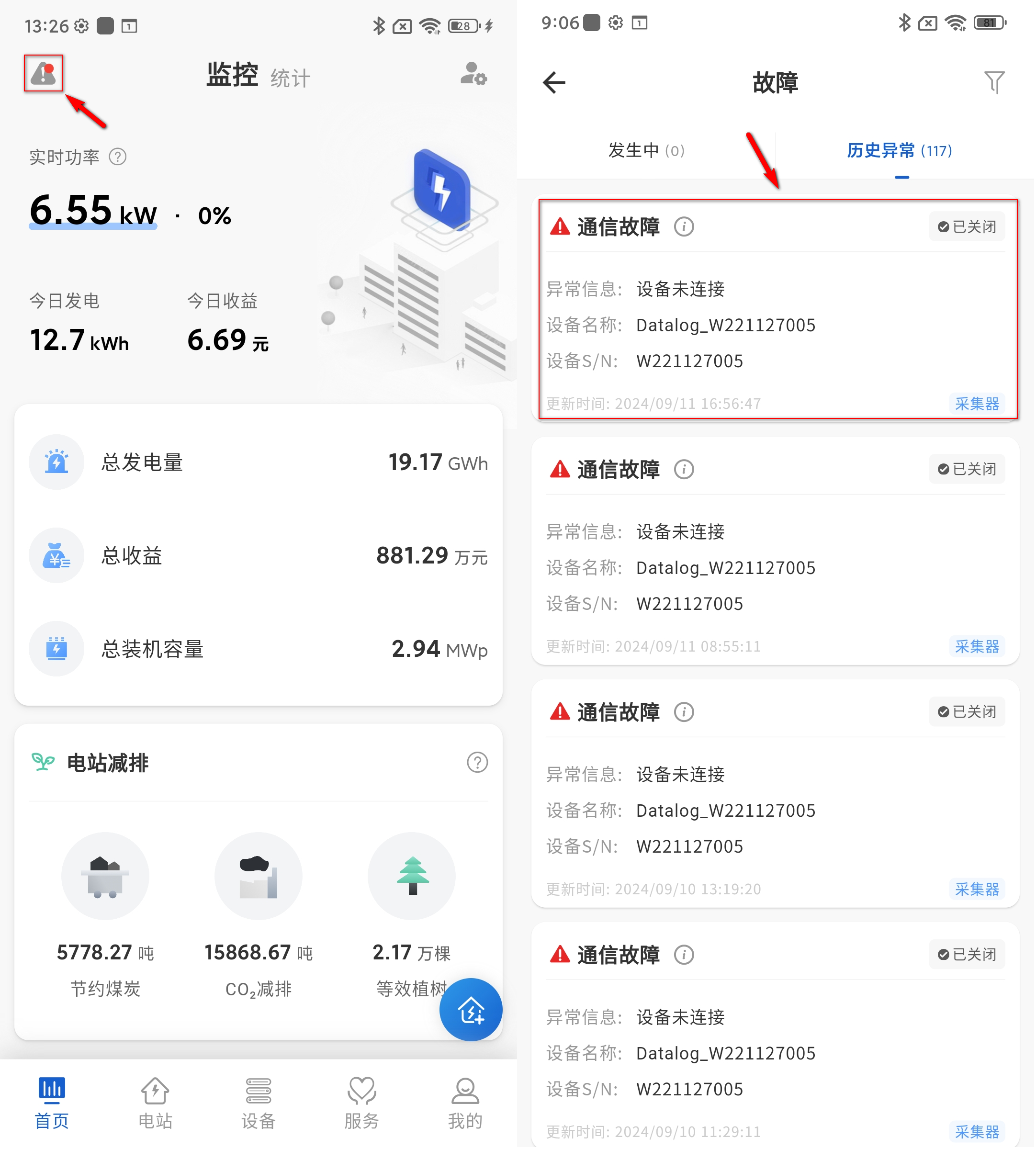点击首页中的按钮查看所有与您关联电站下的设备故障数据(默认展示的是正在发生中的故障)。