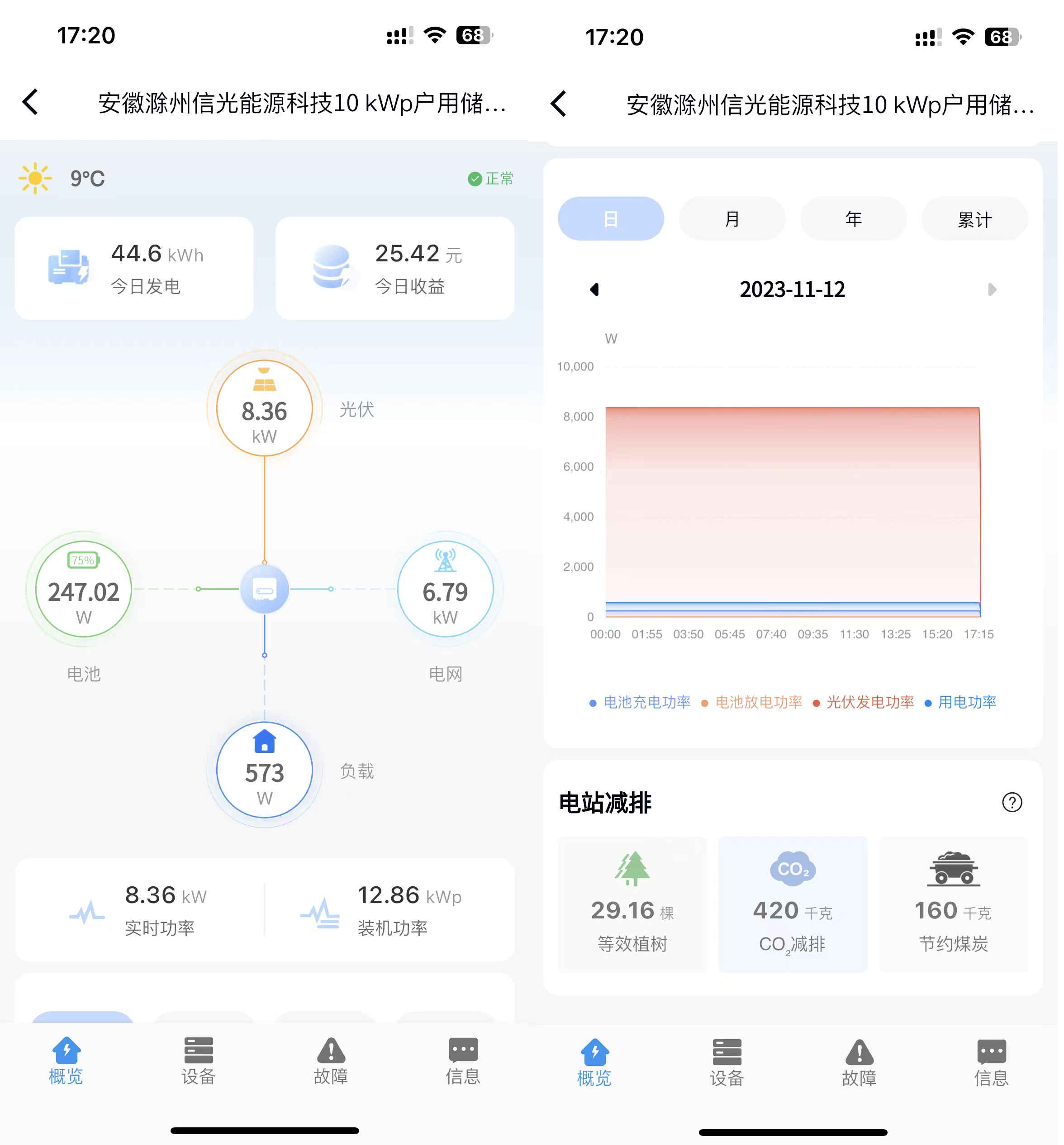[发电情况]展示该电站的光伏发电功率、用电功率和电池充放电功率,月、年、累计则展示对应的电量数据。