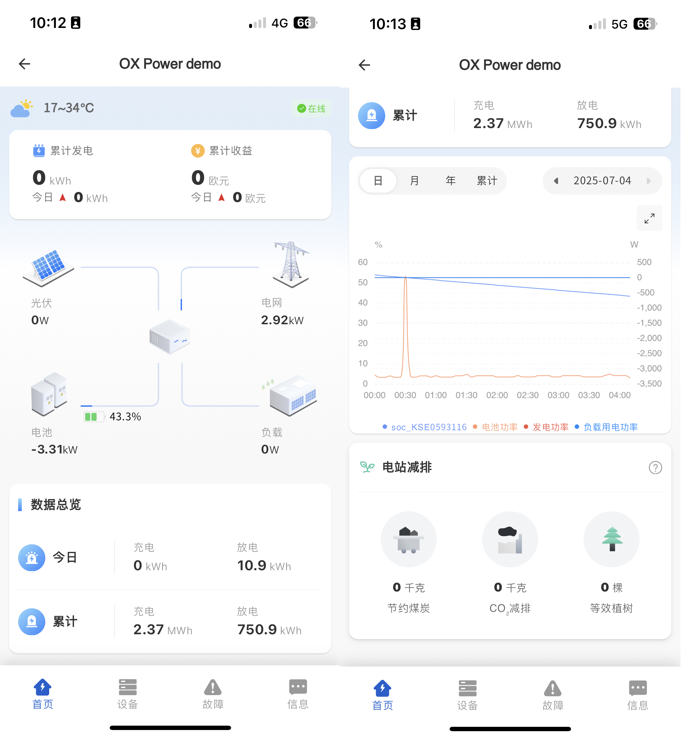APP支持建设两种不同类型的电站,实时监测和展示运行数据,可以进行异常检测、数据存储分析以及可视化图表与报表等功能,帮助用户更好地管理电站并优化性能。