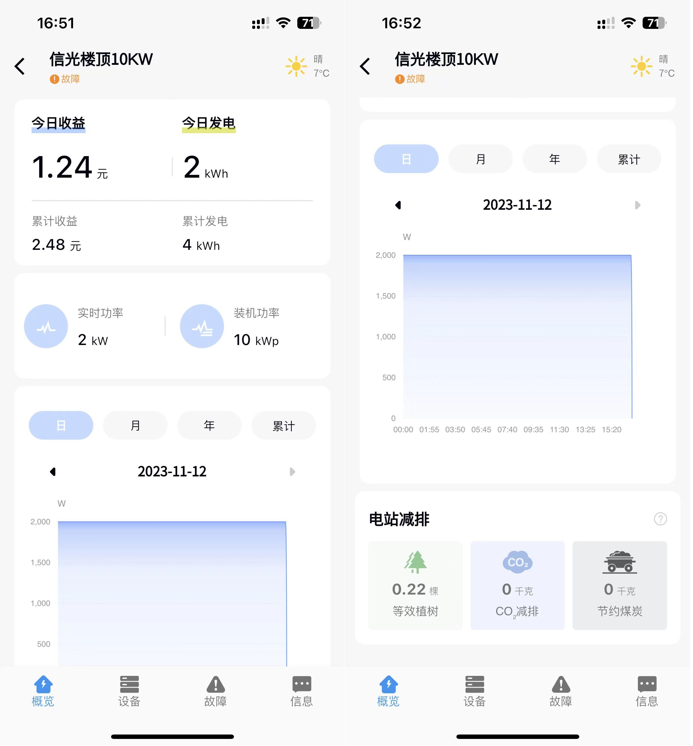 [实时发电]展示电站的当前功率、装机总功率数据。