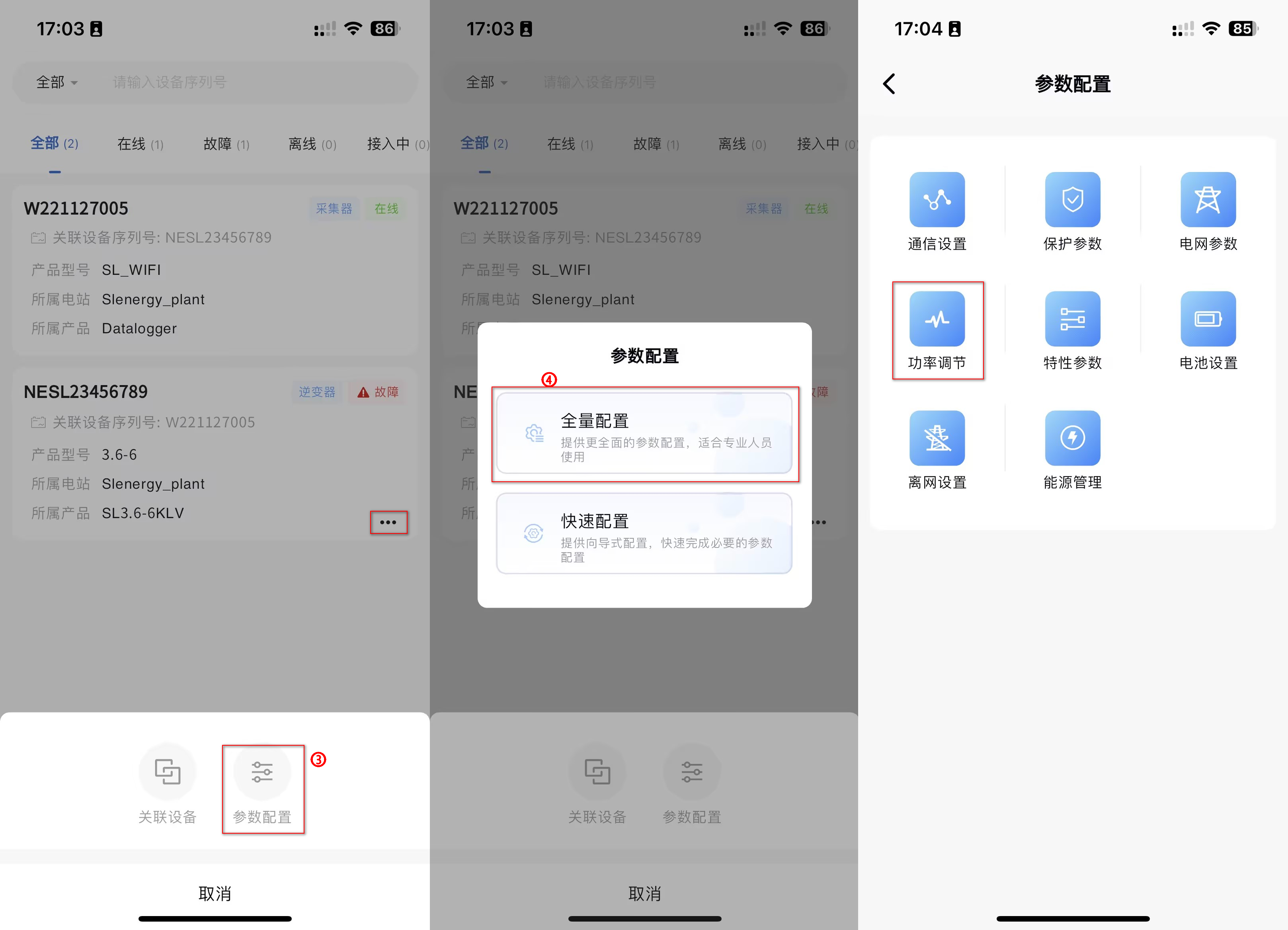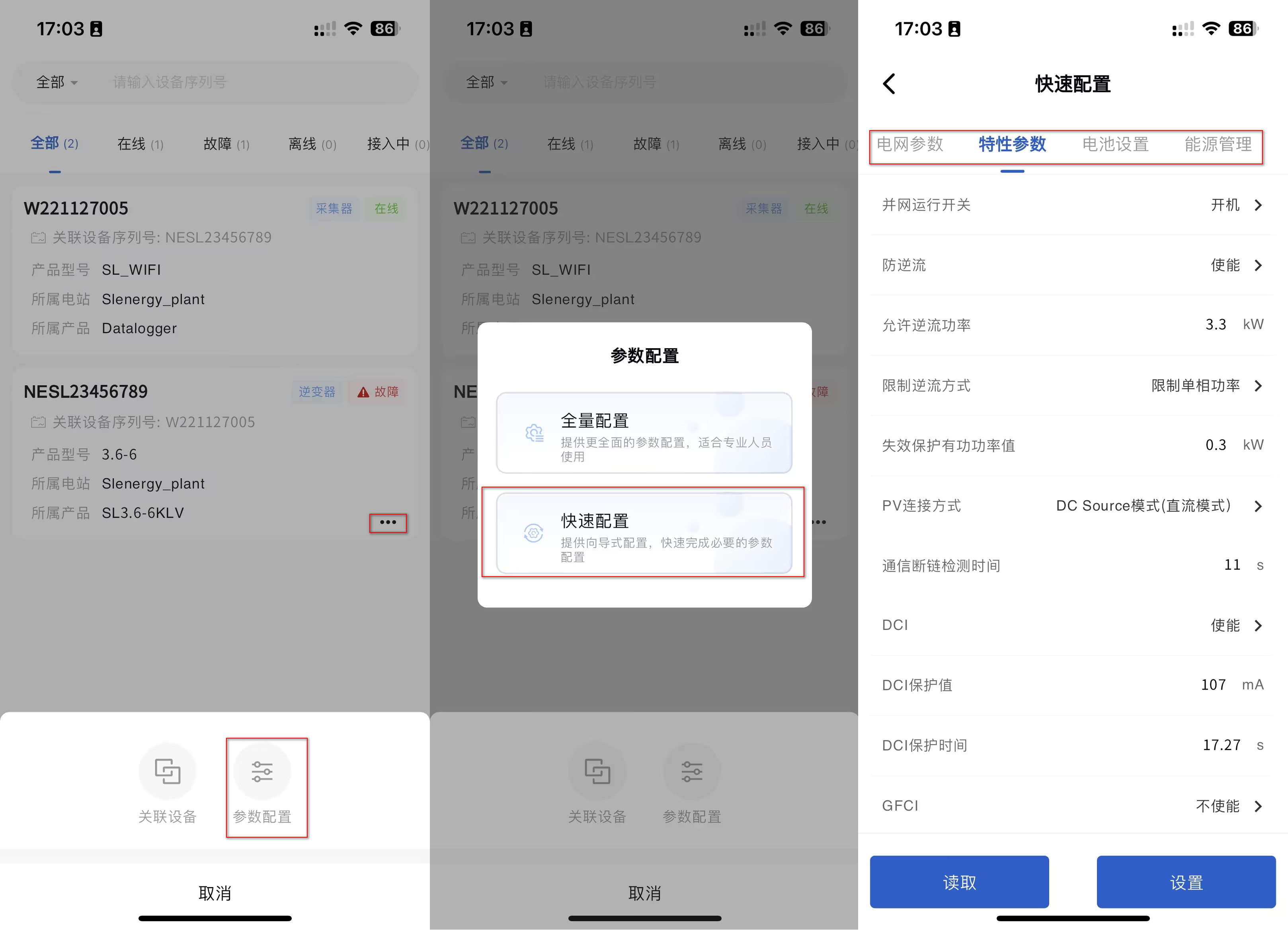 本系统支持在电站-设备列表,对设备工作参数进行读取或者设置的操作。