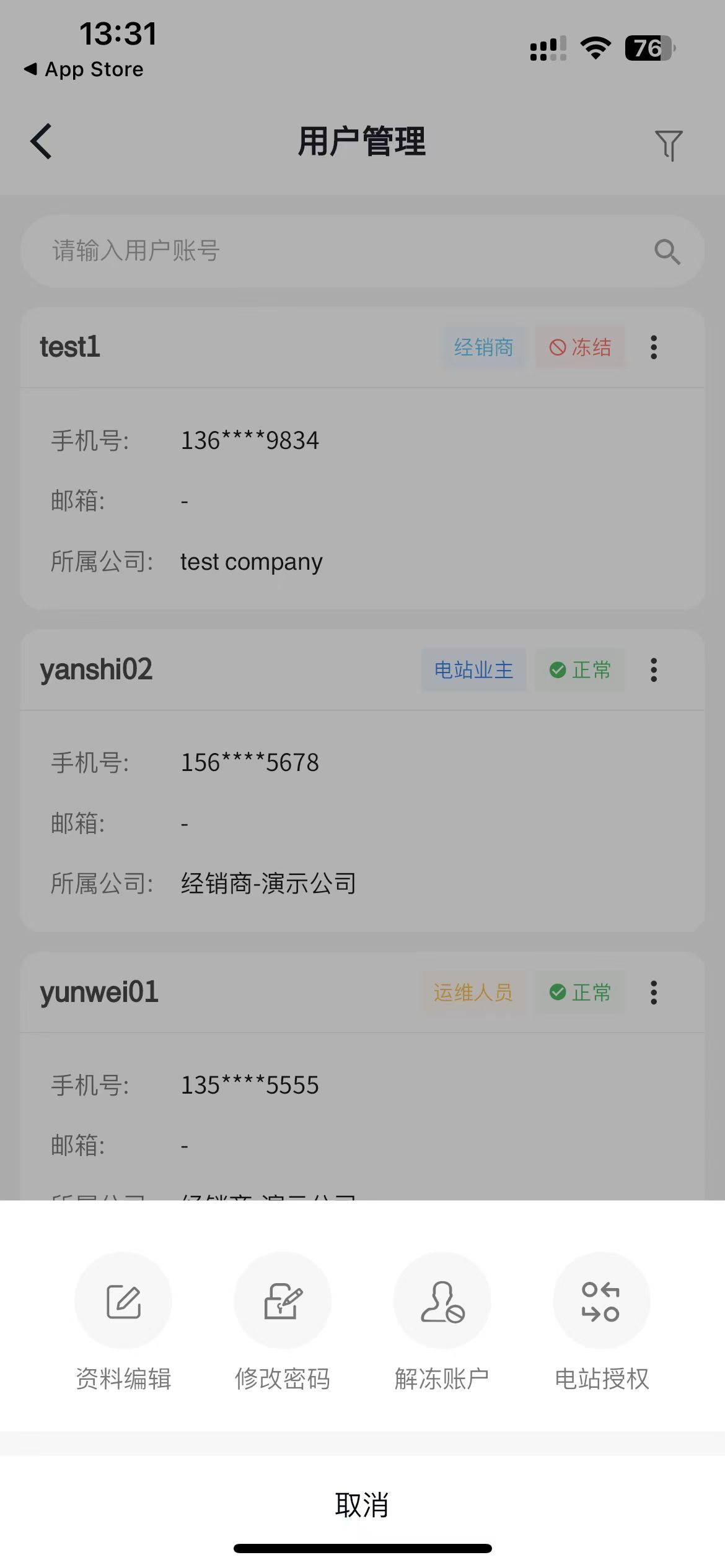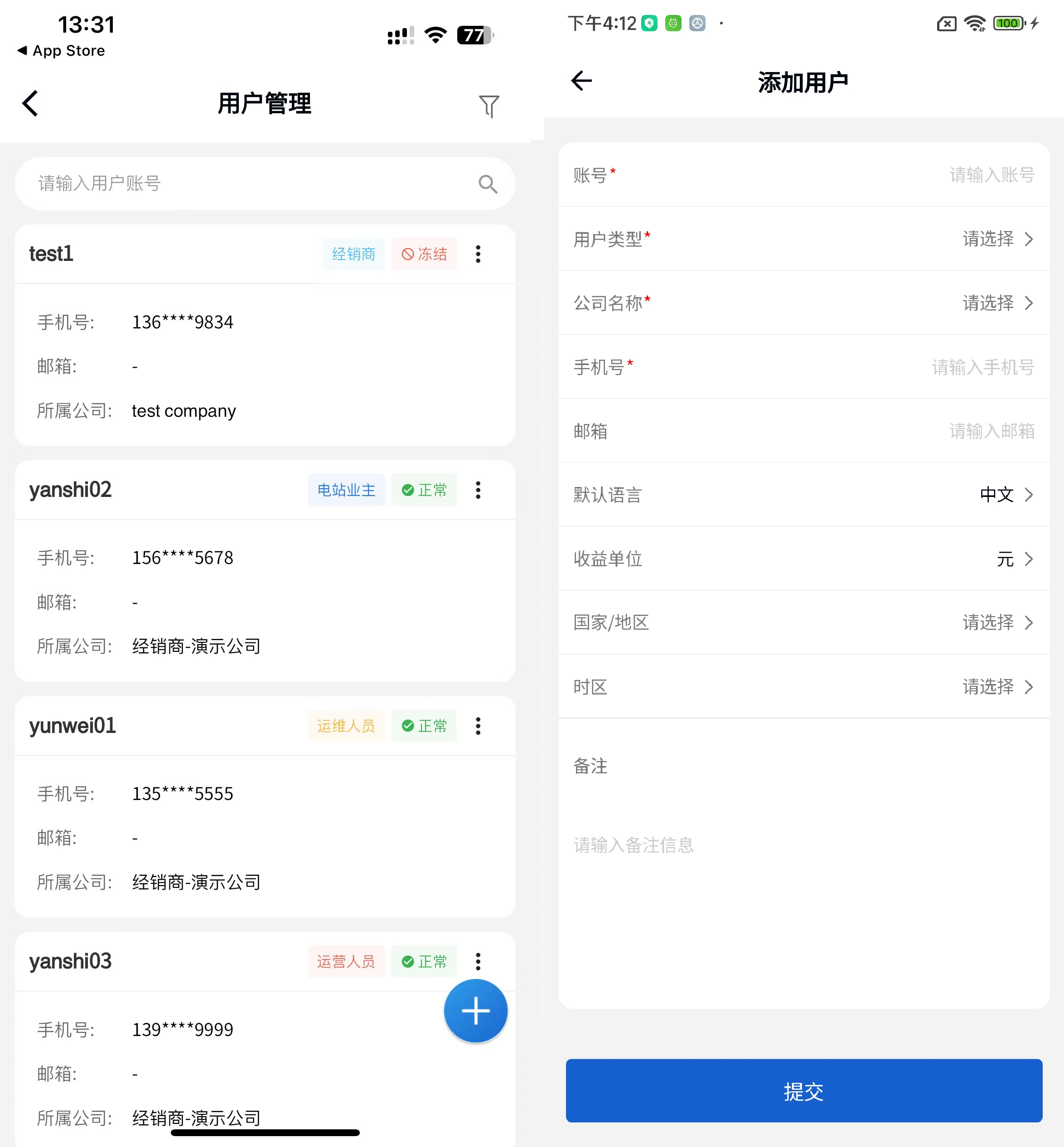 Smart M支持您在移动端创建不同角色人员来协助维护和管理电站,通过在创建时选择不同的用户类型来区分不同角色用户。