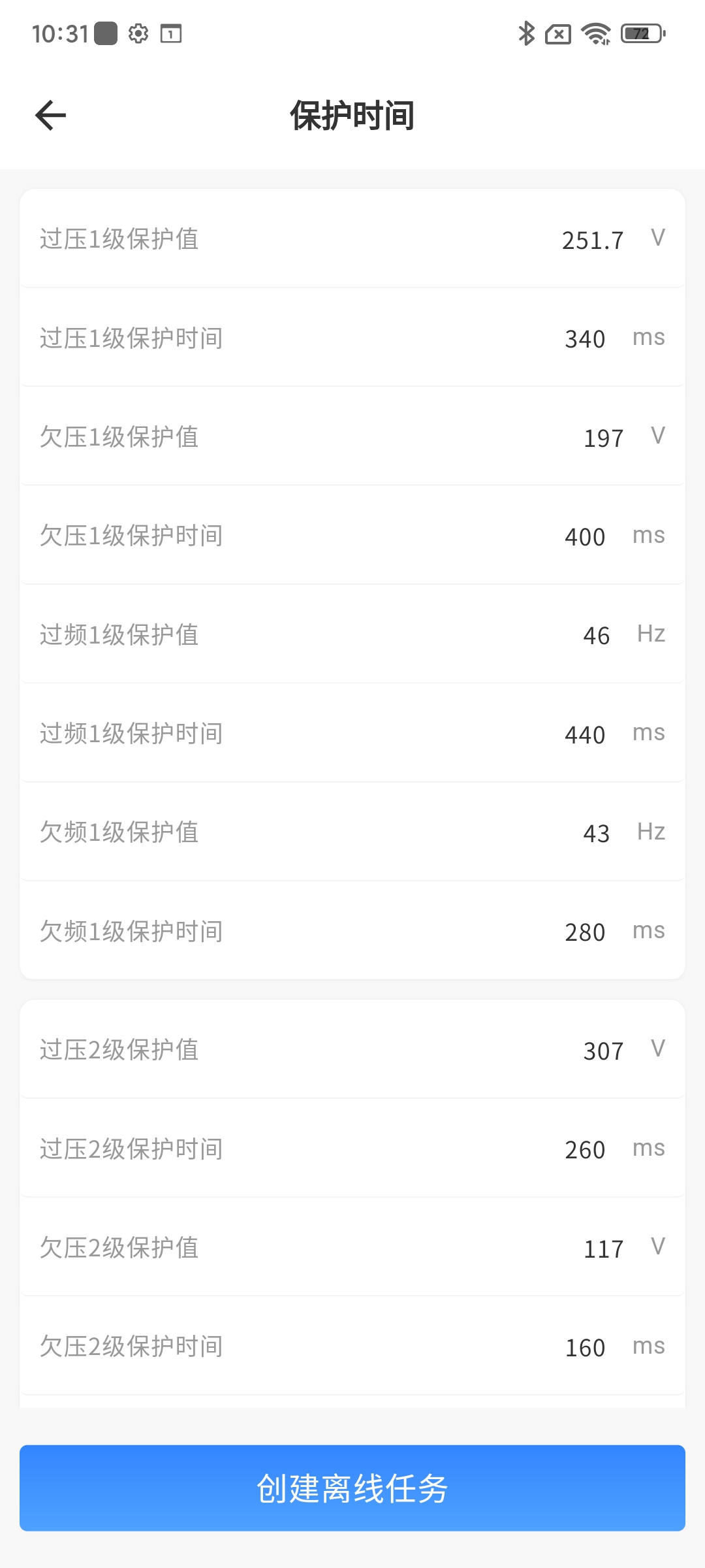 欠频2级保护时间(ms) | 从市电2级欠频到机器保护所用的时间(设置法规会自动修改至对应法规设置值,不建议用户修改) | 最低设置20ms |