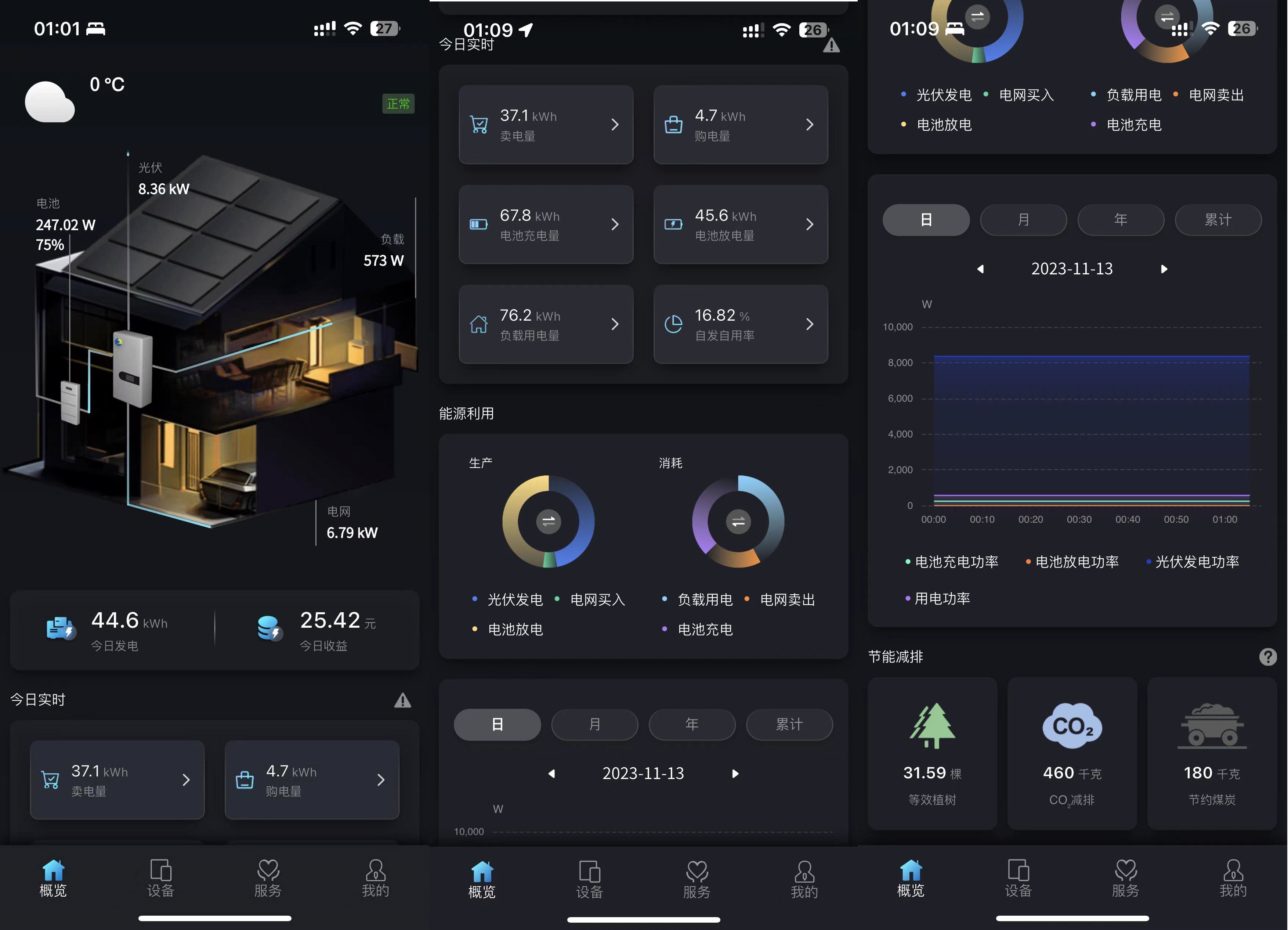 [日]展示您所选电站今日的发电功率情况。您也可以点击日期框选择任意一天,查看这一天的光伏发电功率、用电功率、电池充电功率和电池放电功率数据。