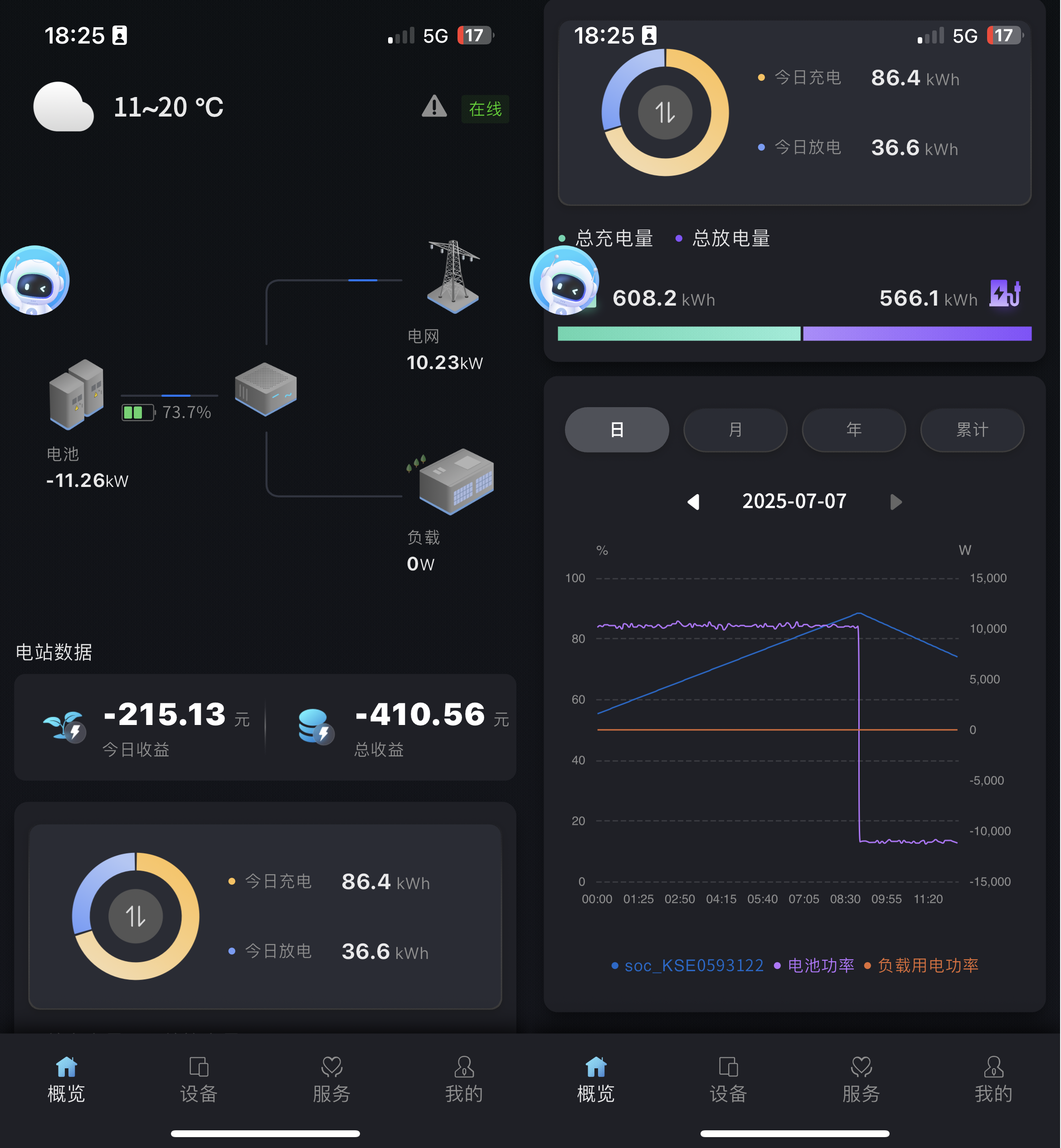 [日]展示您当前电站今日的电池功率情况和负载用电情况。您也可以点击日期框选择任意一天,查看这一天的电池功率和负载用电功率数据。